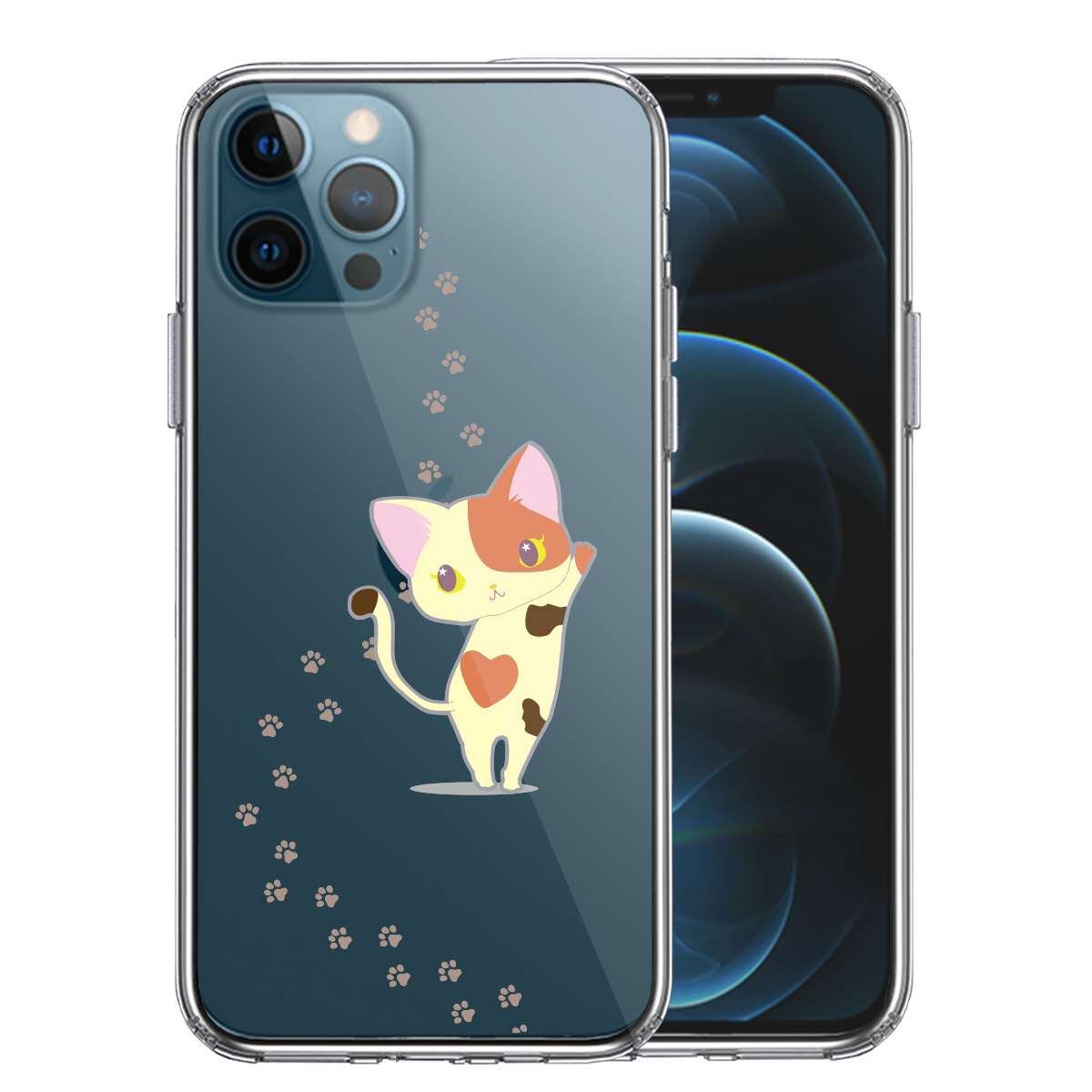iPhone12 Pro 側面ソフト 背面ハード ハイブリッド クリア ケース ジャケット 三毛猫 フットプリント