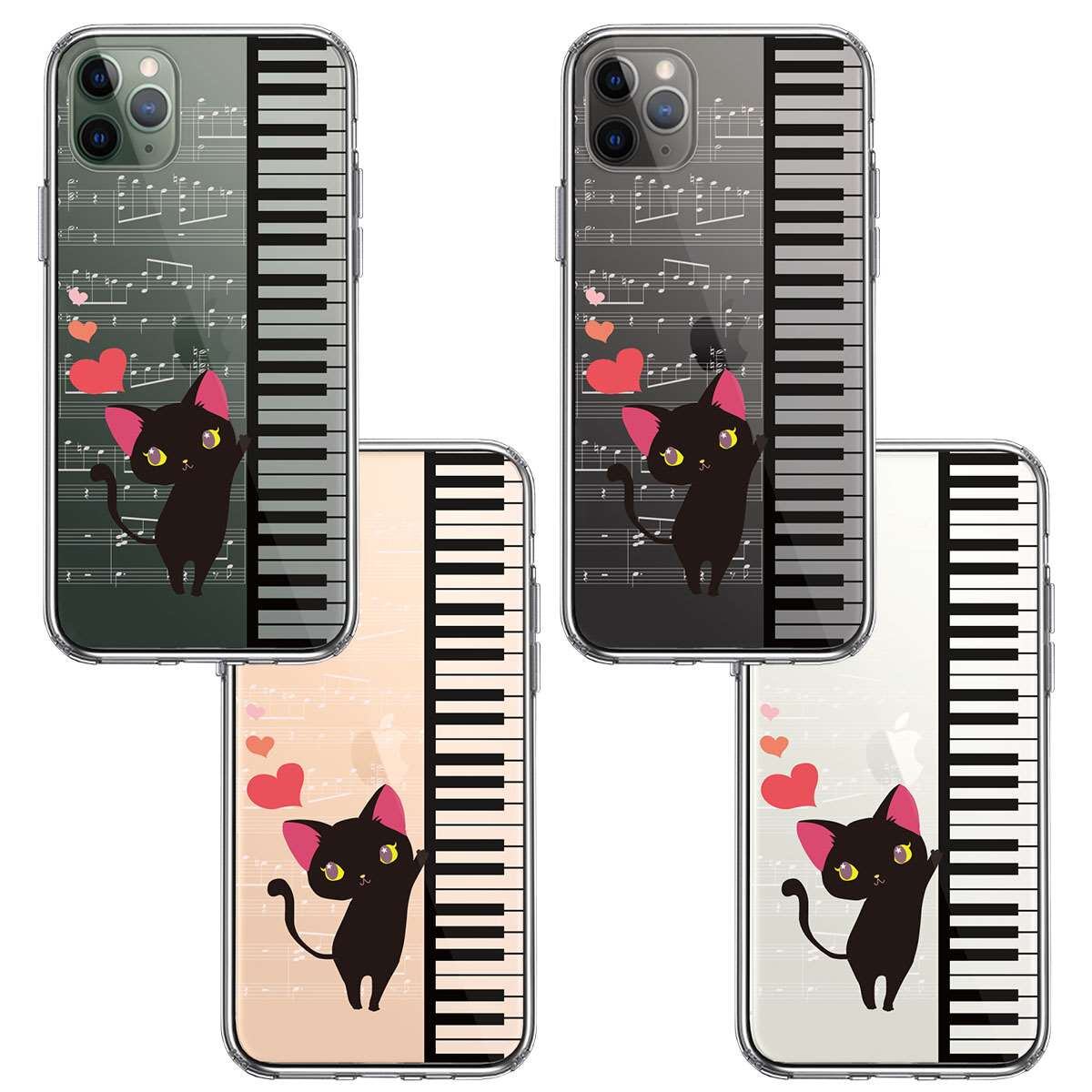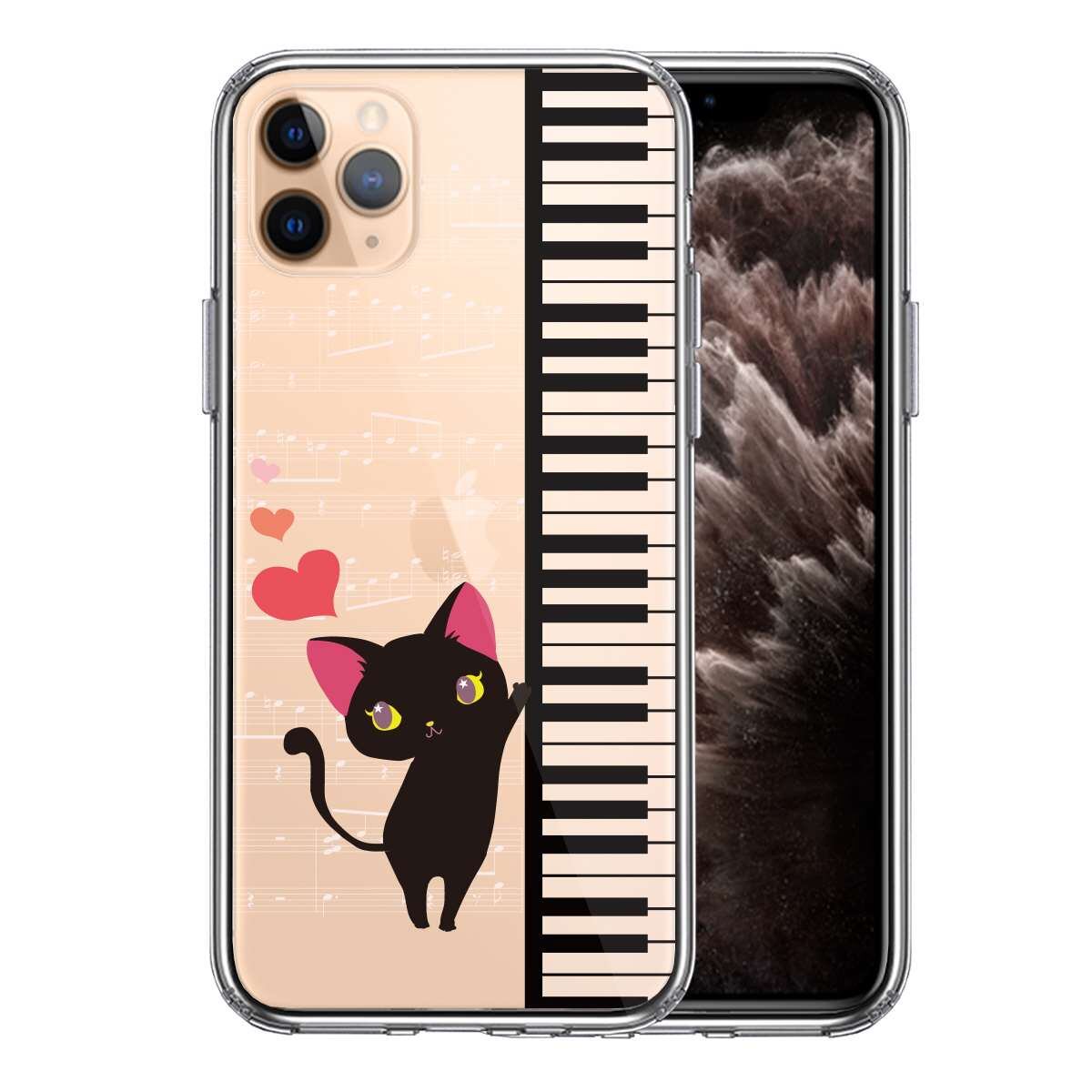 iPhone11pro 側面ソフト 背面ハード ハイブリッド クリア ケース ピアノ 猫ふんじゃった ハート
