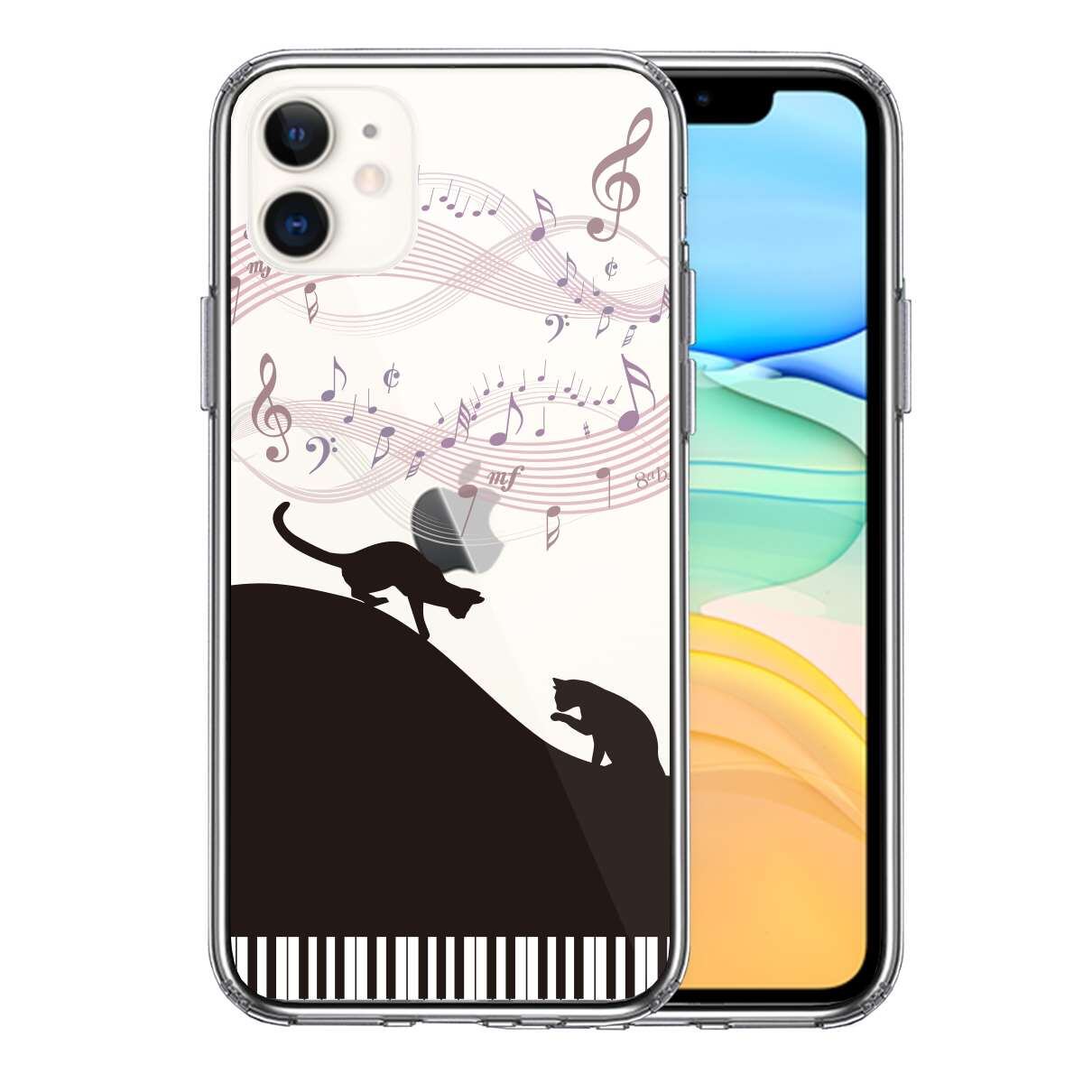 iPhone11 側面ソフト 背面ハード ハイブリッド クリア ケース カバー ピアノ シルエット猫 ブラック