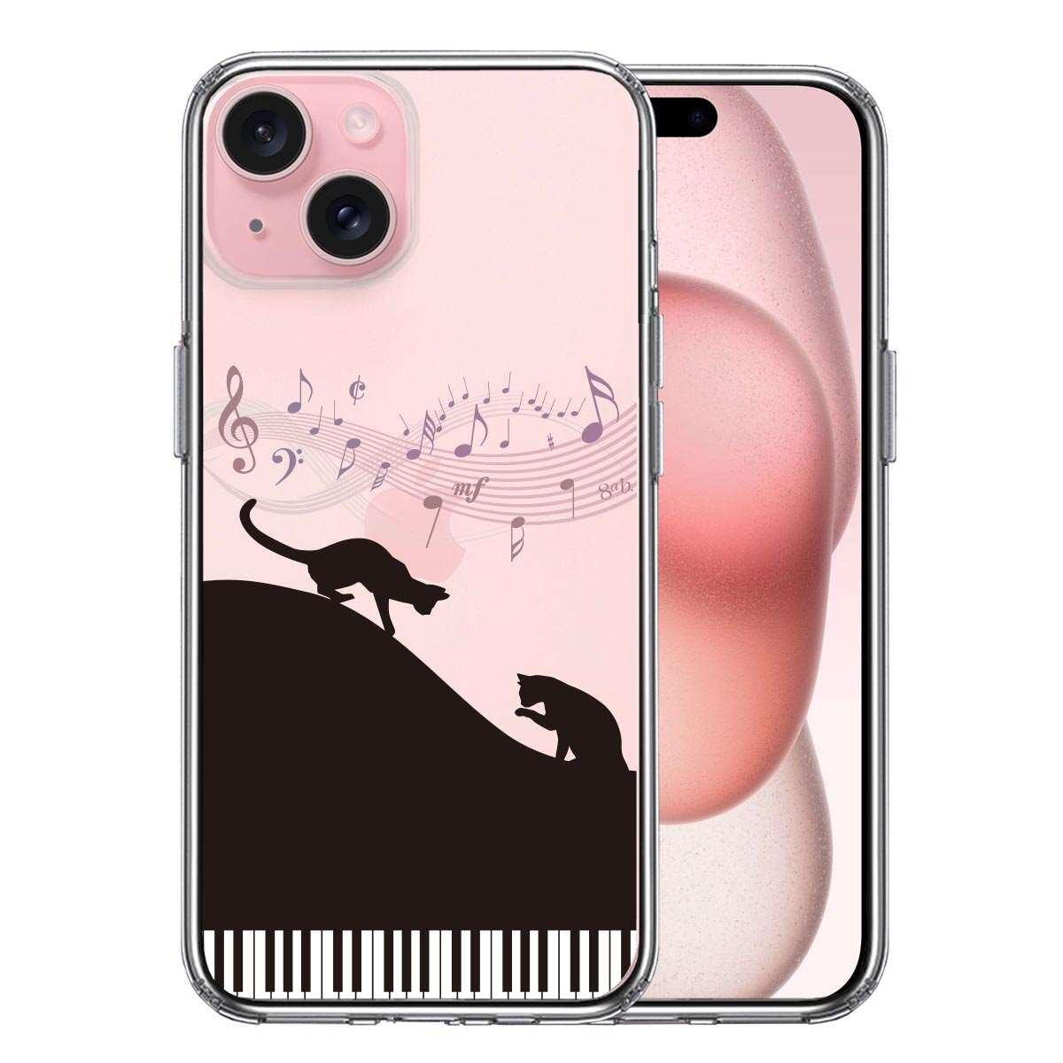 iPhone15 側面ソフト 背面ハード ハイブリッド クリア ケース ピアノ シルエット猫 ブラック