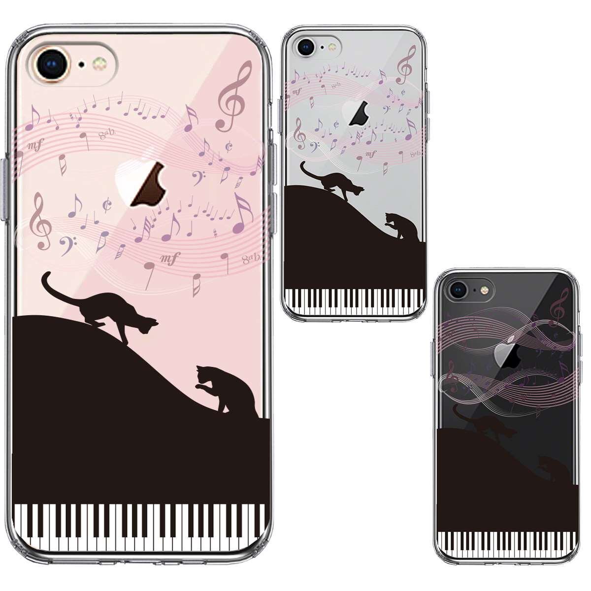 iPhone7 iPhone8 兼用 側面ソフト 背面ハード ハイブリッド クリア ケース ピアノ シルエット猫 ブラック