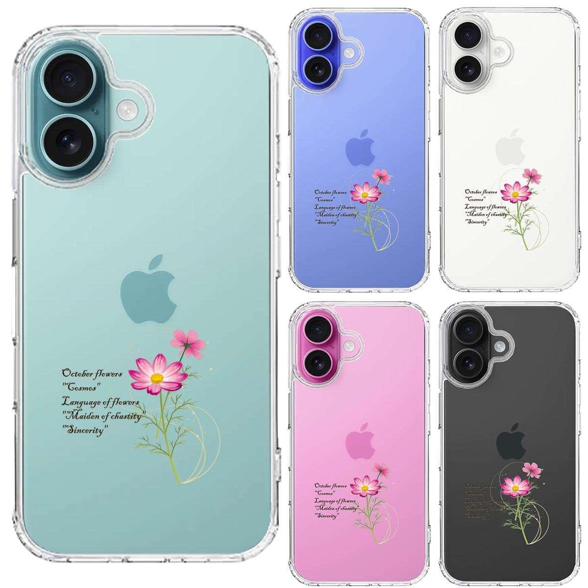 iPhone16 側面ソフト 背面ハード ハイブリッド クリア ケース 一輪花 10月 コスモス