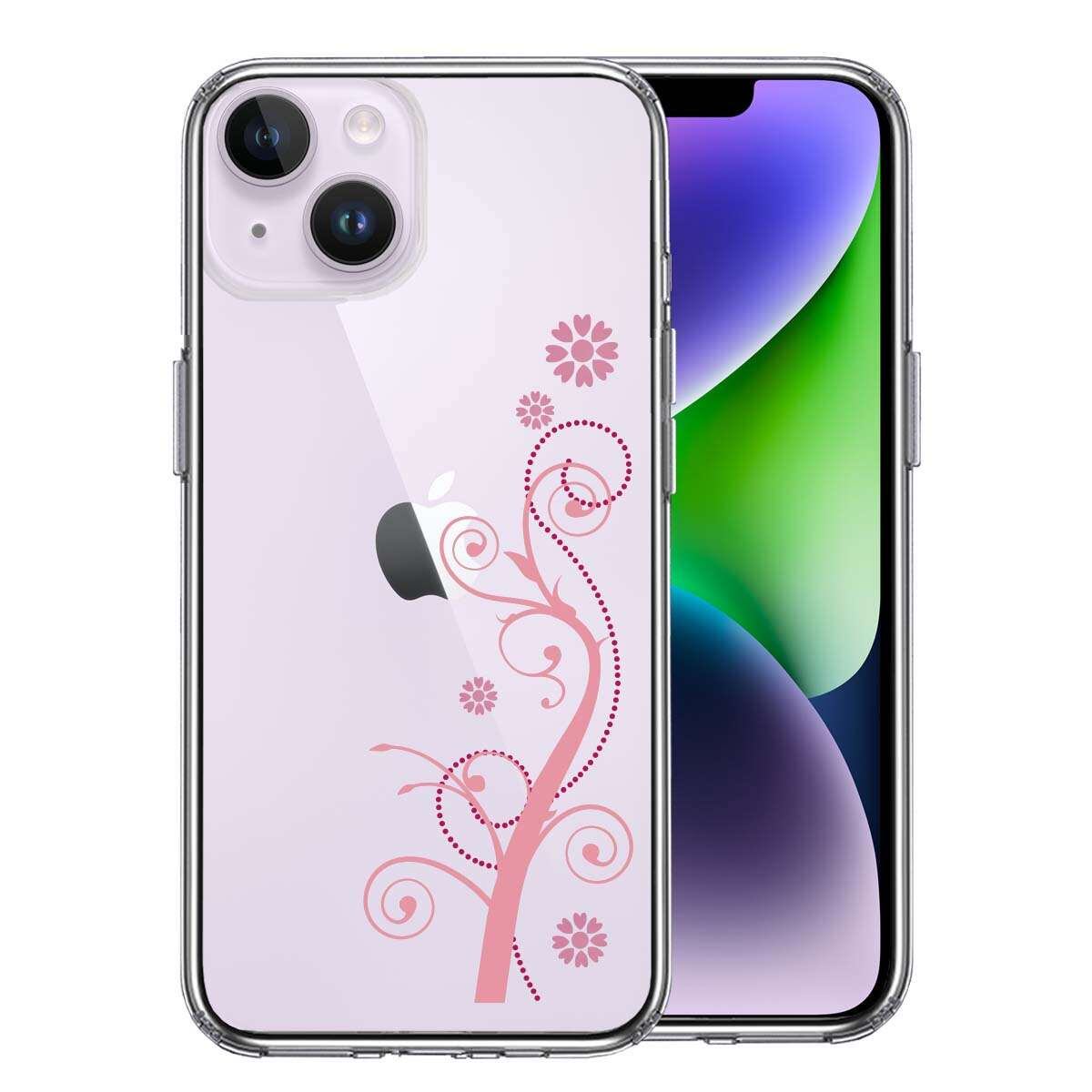 iPhone 14 Plus 側面ソフト 背面ハード ハイブリッド クリア ケース フローラル つる模様 ピンク
