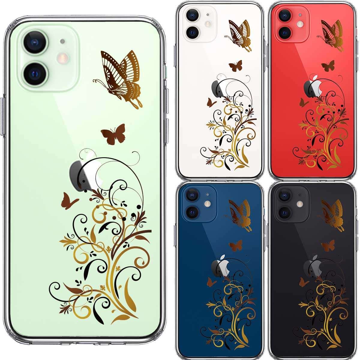 iPhone12 側面ソフト 背面ハード ハイブリッド クリア ケース フローラル バタフライ (ブラウン)