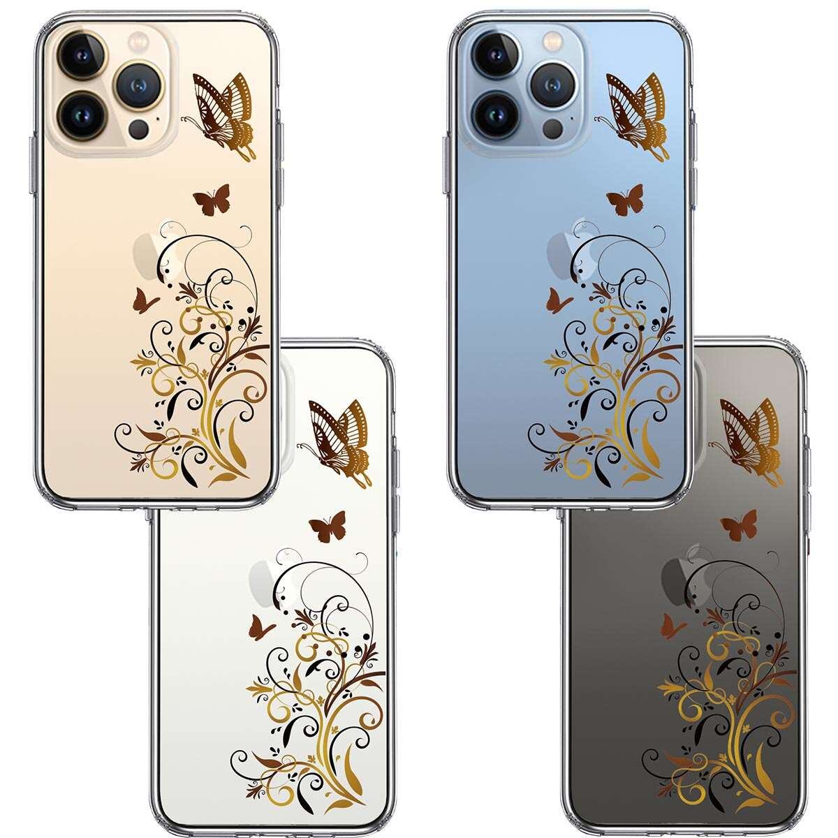 iPhone13 Pro 側面ソフト 背面ハード ハイブリッド クリア ケース フローラル バタフライ (ブラウン)
