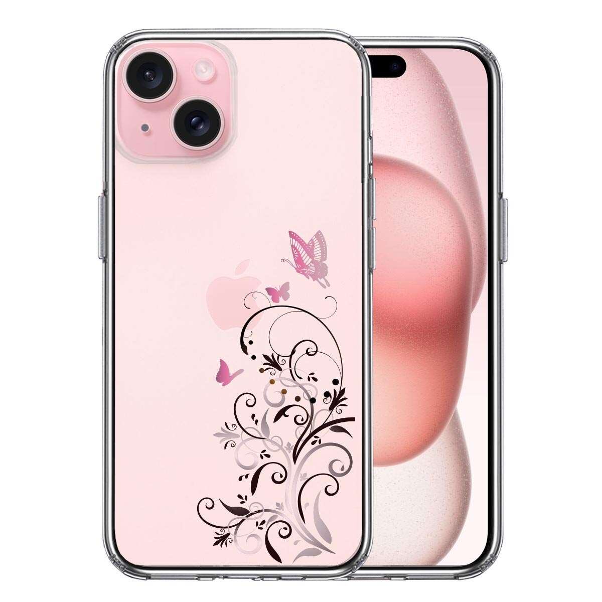 iPhone 15 Plus 側面ソフト 背面ハード ハイブリッド クリア ケース フローラル バタフライ (ピンク)