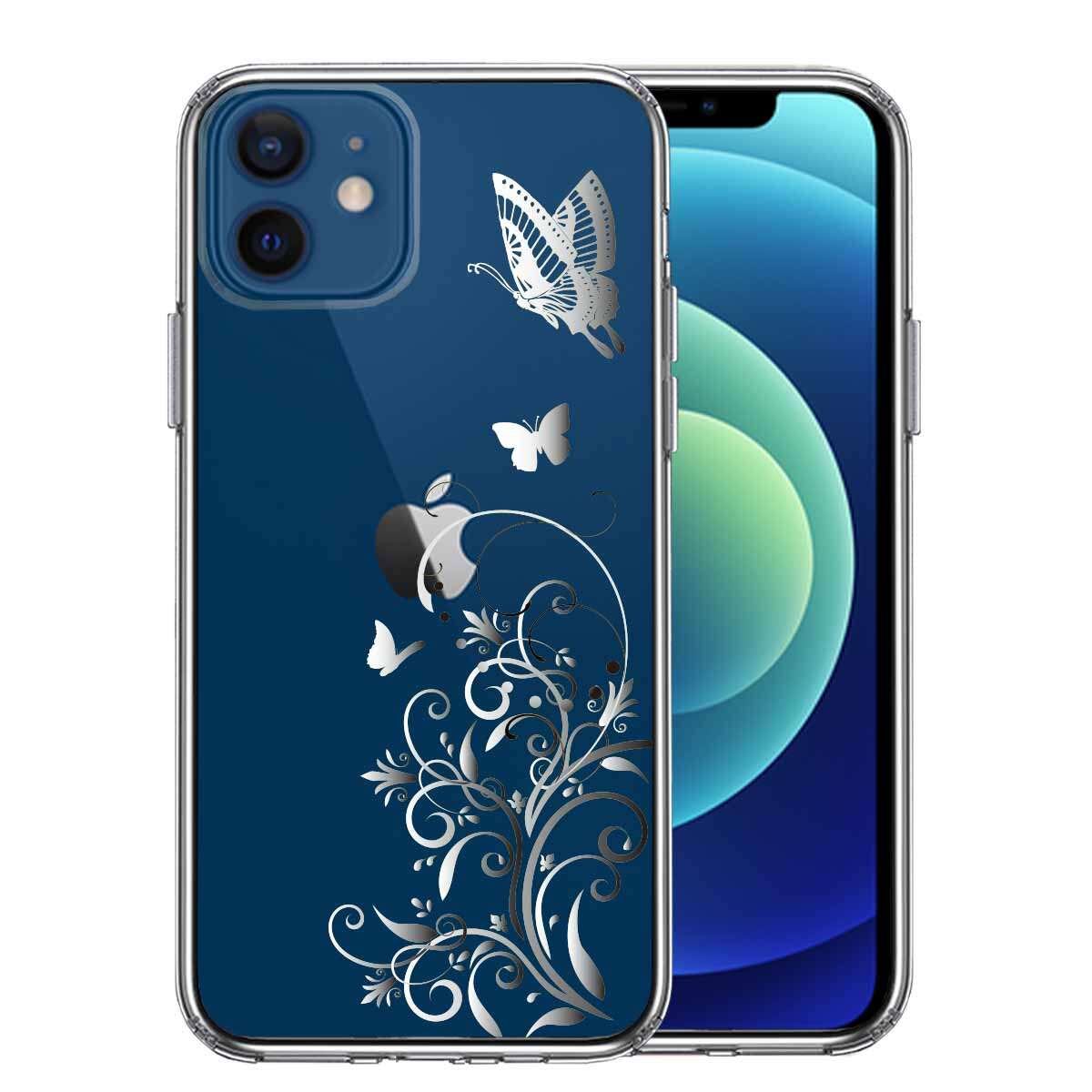 iPhone12mini 側面ソフト 背面ハード ハイブリッド クリア ケース フローラル & バタフライ (グレー)