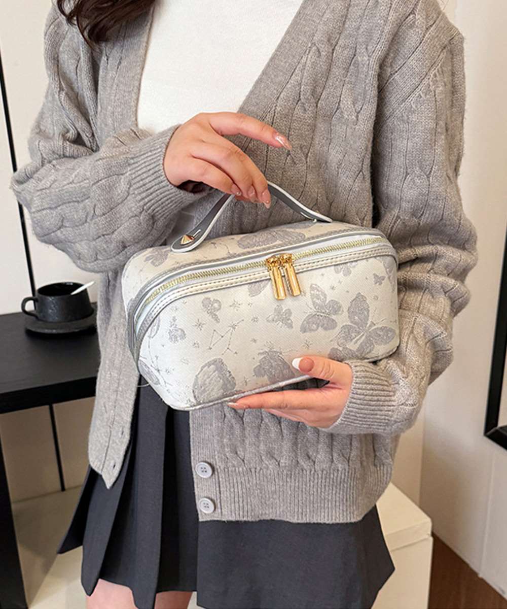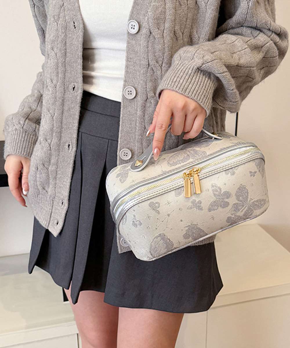 上品な刺しゅう風デザインの大容量メイクポーチ。