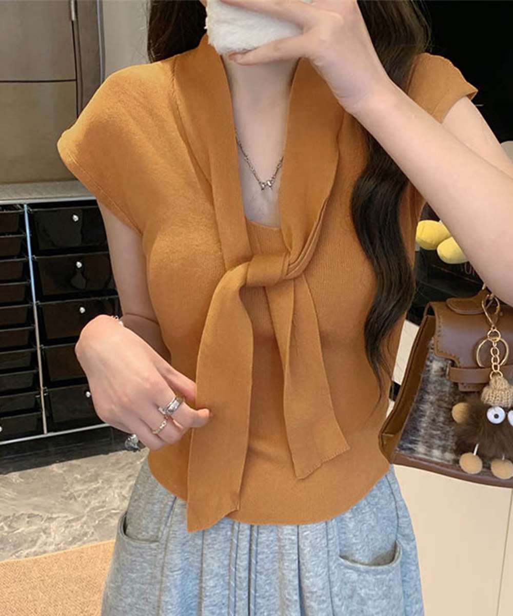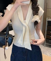 ボウタイデザインが目を惹くフレンチスリーブサマーニット