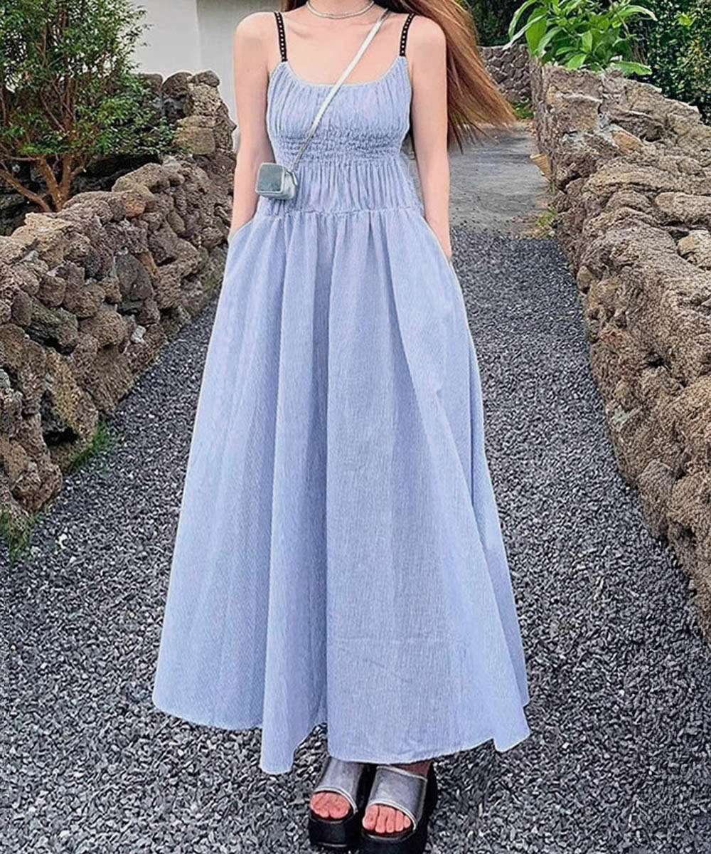 涼しげなストライプ柄が目を引く、大人可愛いキャミワンピース。