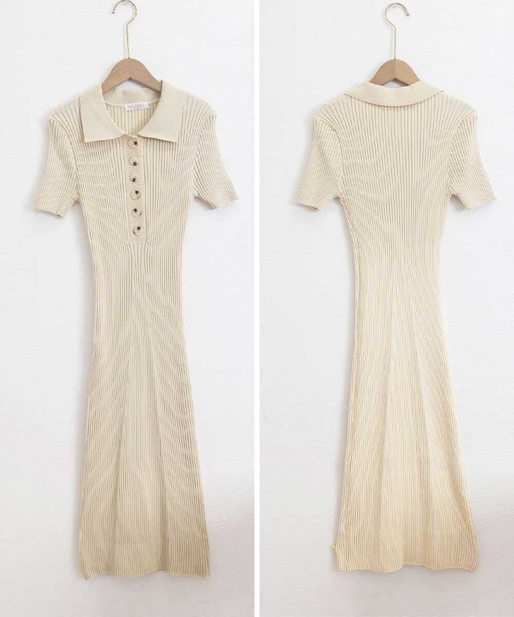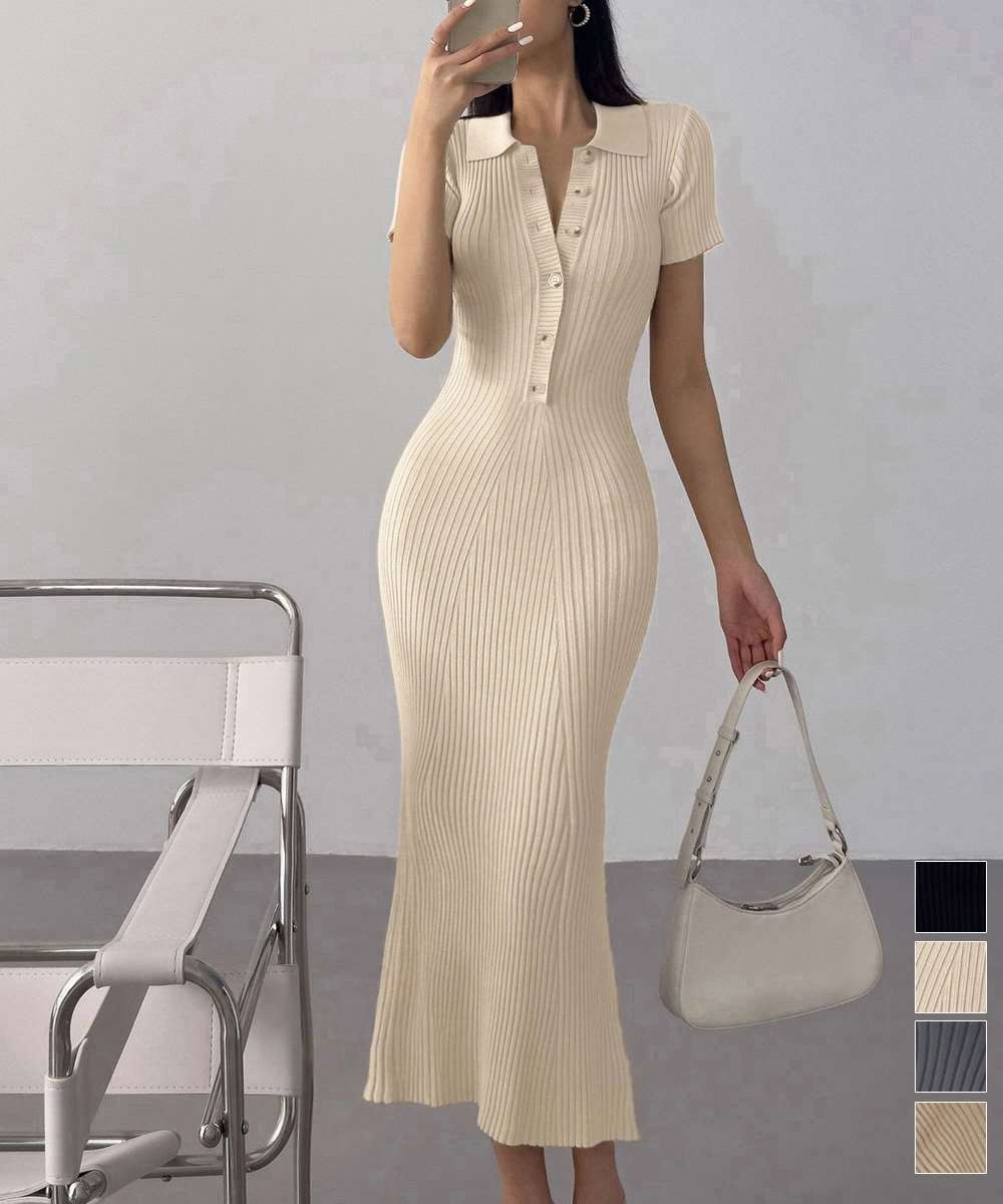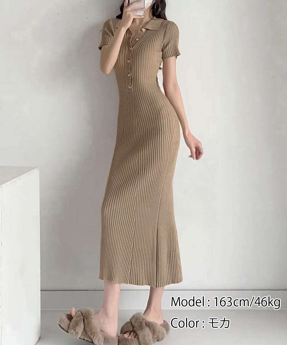上品で女性らしい印象を与える、襟付きリブ編みニットワンピース。