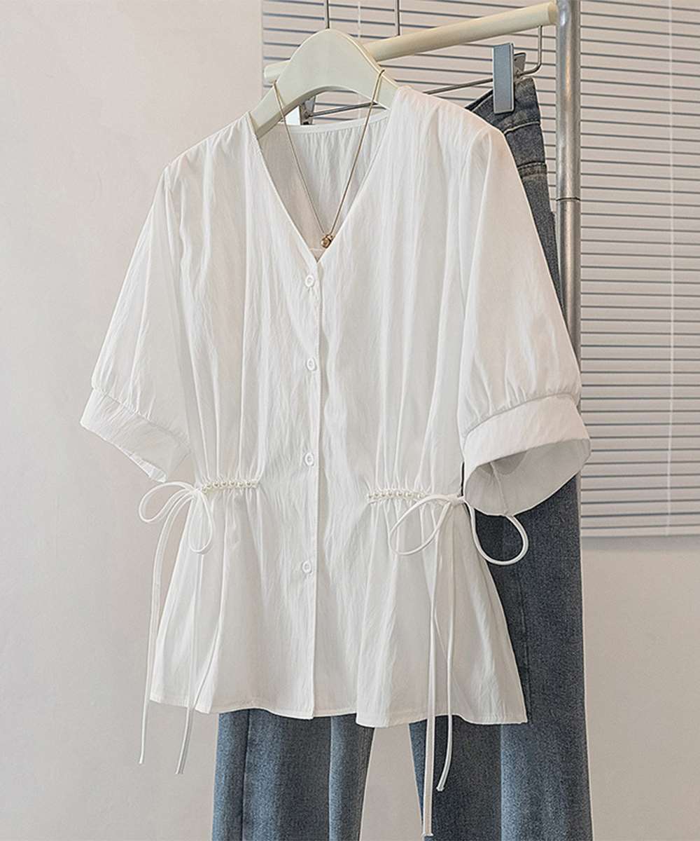 ドロスト シャツ ブラウス パール付 半袖