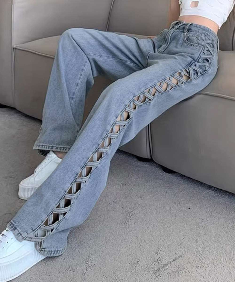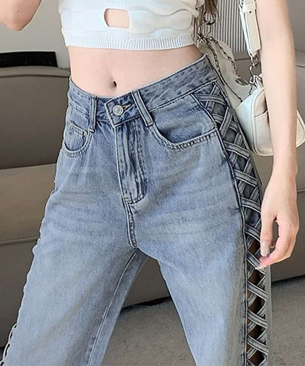 大胆なサイド編み上げデザインが目を引く、個性派デニムパンツ。