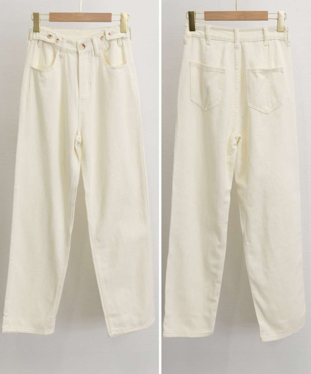 ウエストボタンでサイズ調節OK!ハイウエスト×ストレートの美脚デニムパンツ。