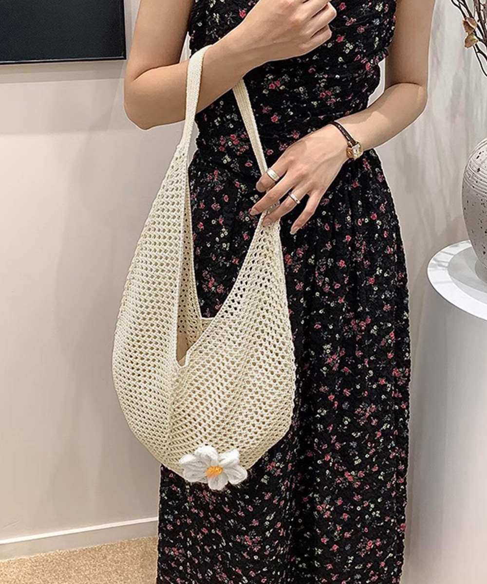 ナチュラルな雰囲気漂う、花モチーフ付きのニット編みトートバッグ。