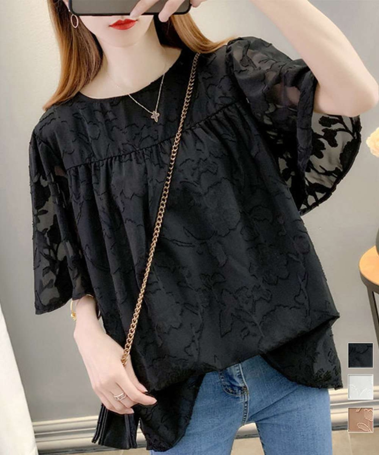 上品なシアー感が魅力の花柄ジャガードブラウス。