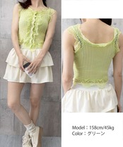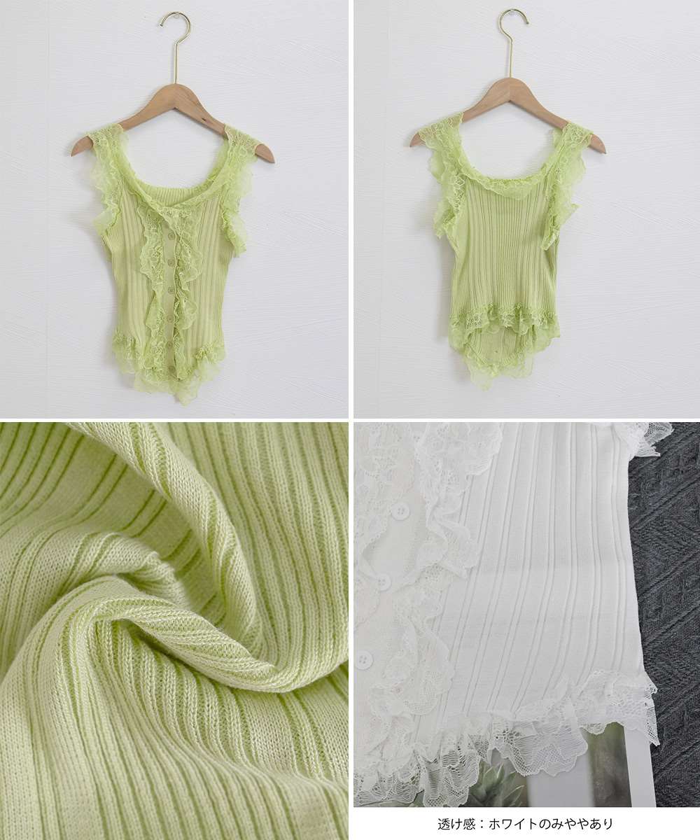 レースフリルが華やかな印象を与える、リブ素材のキャミソール。
