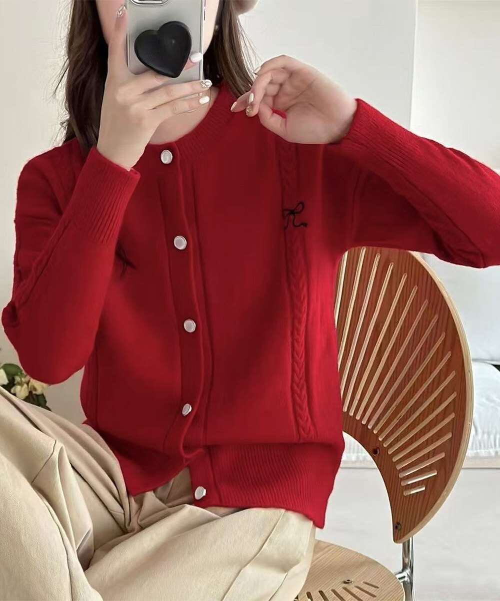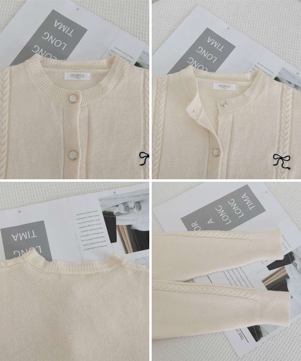 ワンポイントのリボンデザインが目を惹くニットカーディガン。