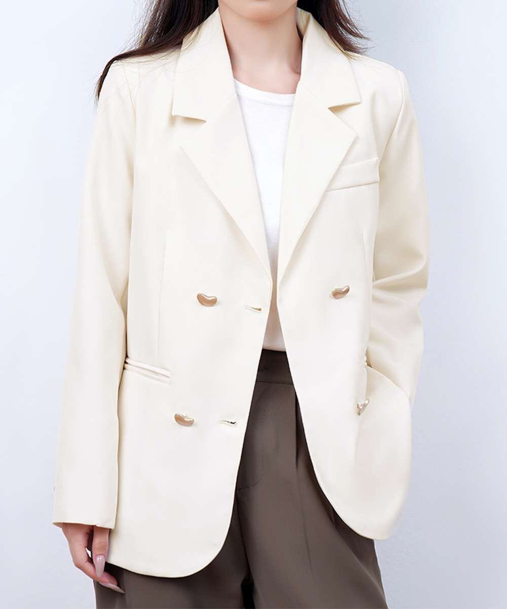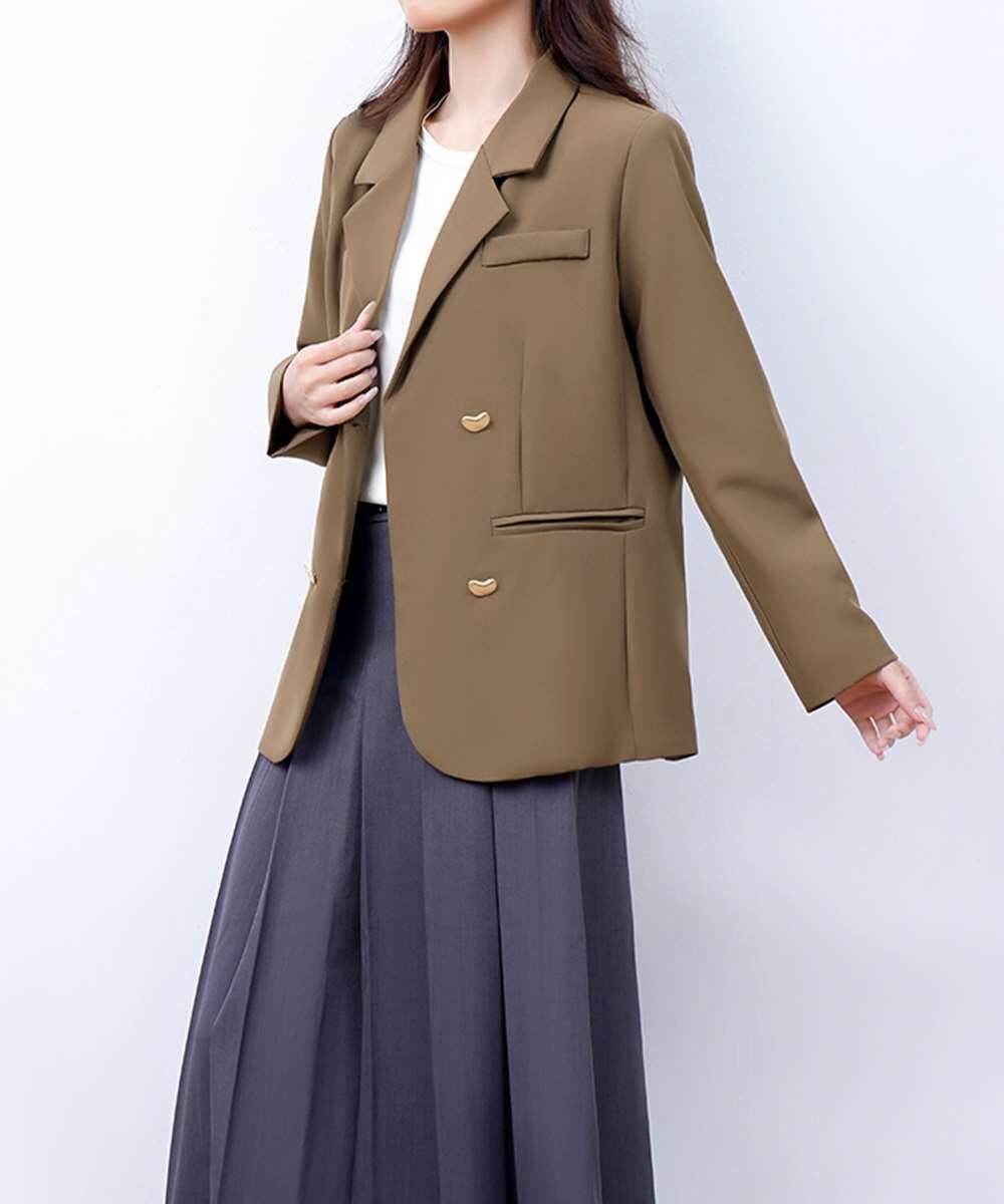 金色のボタンが上品な輝きを放つ、ダブルブレストデザインのテーラードジャケット。