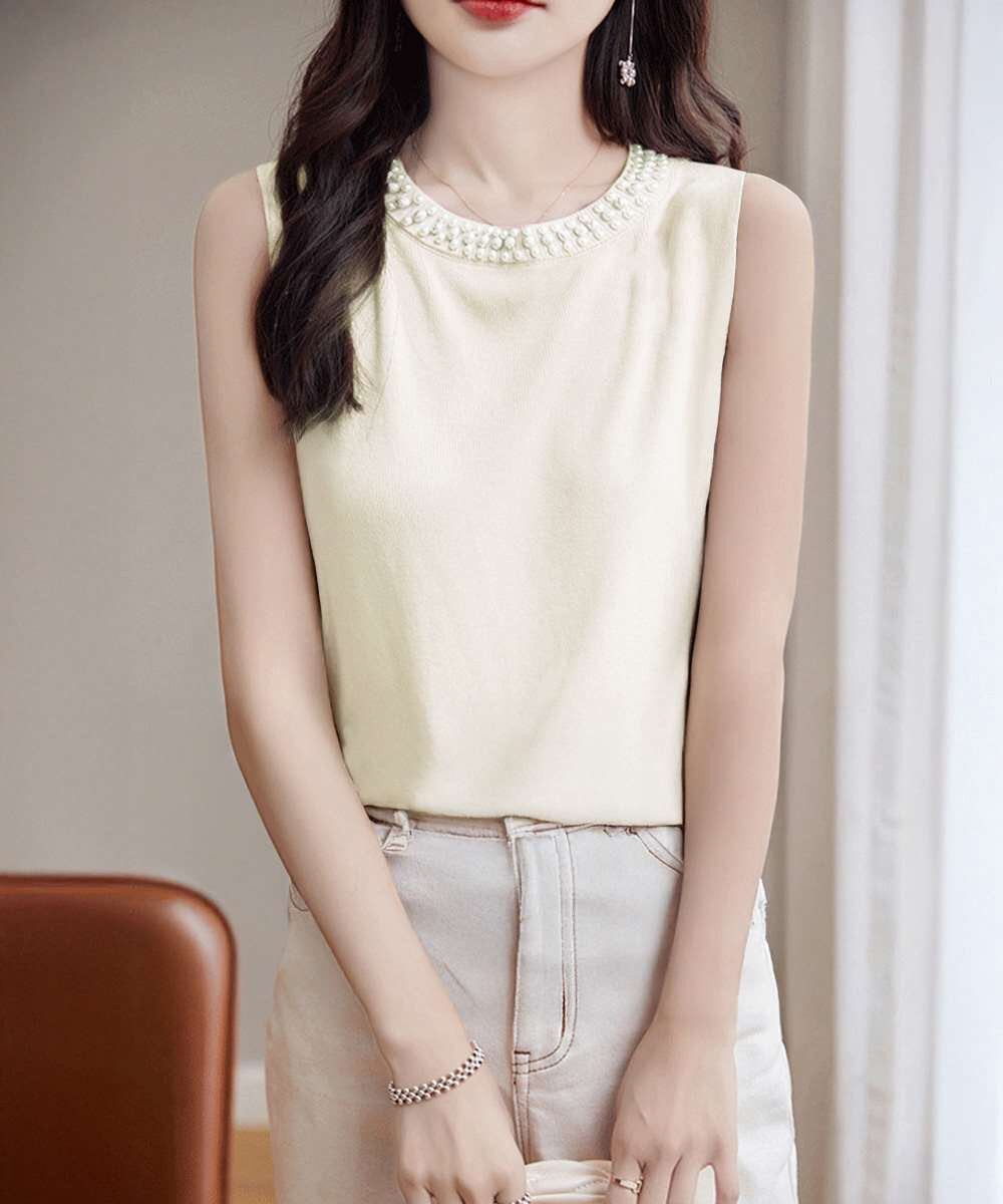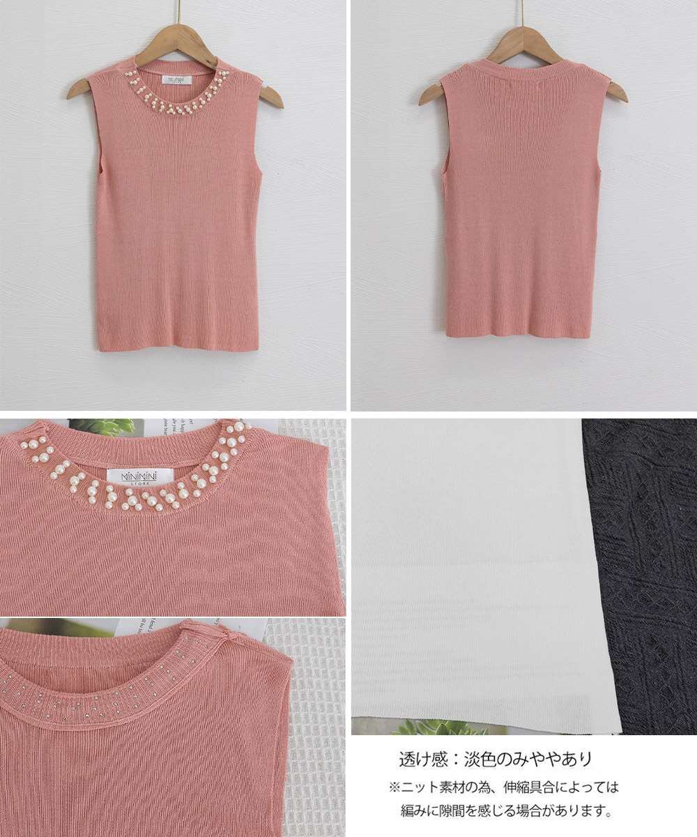 襟元に贅沢にあしらわれたパールが華やかさと上品さを演出するノースリーブニットトップス。