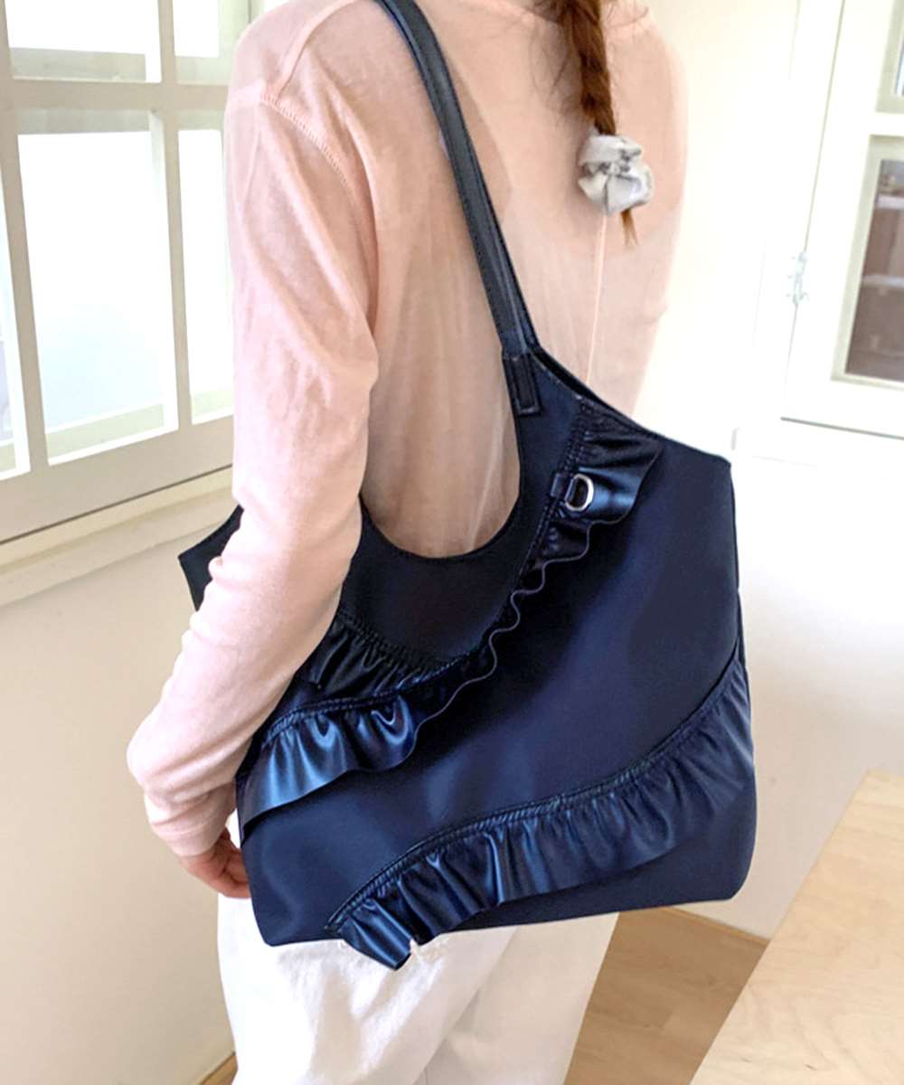 立体感のあるラッフルフリルが目を惹く、モード感漂うトートバッグ。