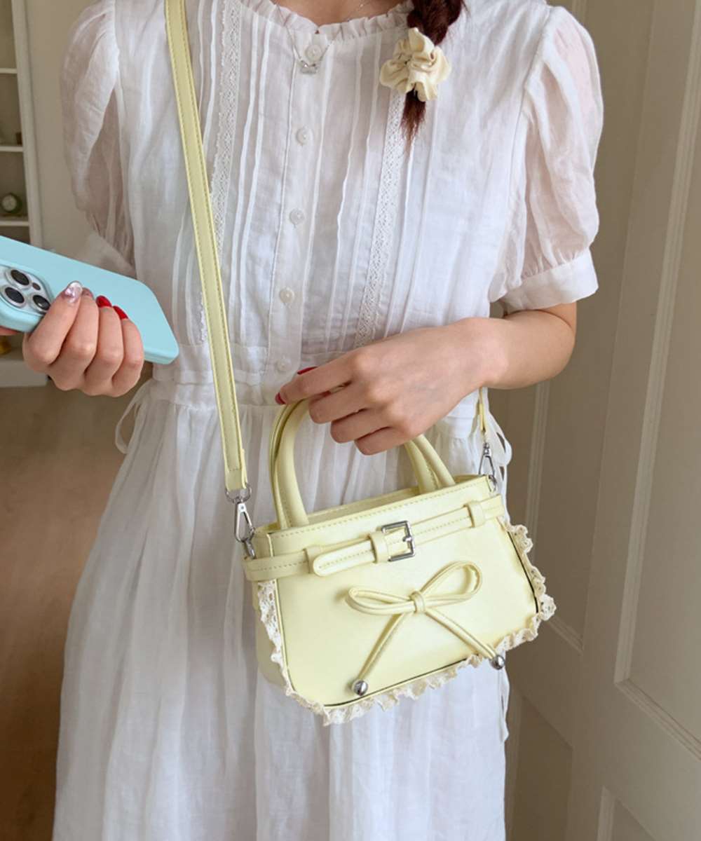 フロントのリボンと縁にあしらわれたレースが目を惹く、フェイクレザー素材の2WAYミニバッグ。