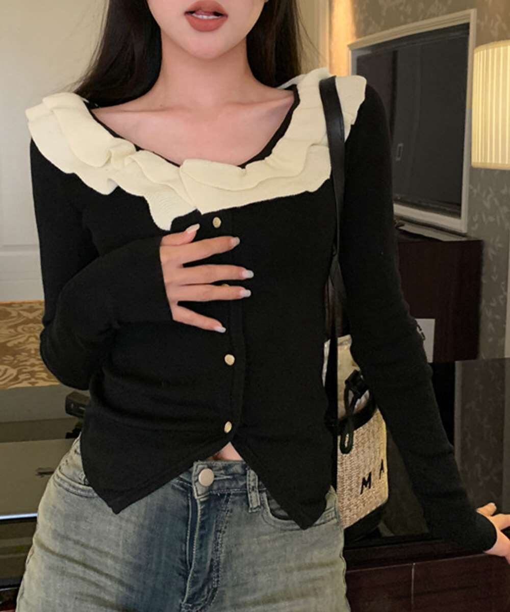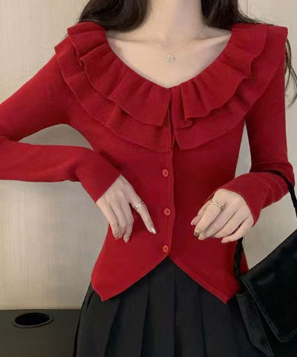 キーワード:おしゃれ長袖服 フリルネックニット 着回しニット韓国風