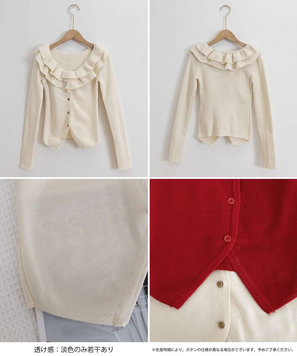 オフショルダー×フリルデザインが魅力のニットカーディガン。
