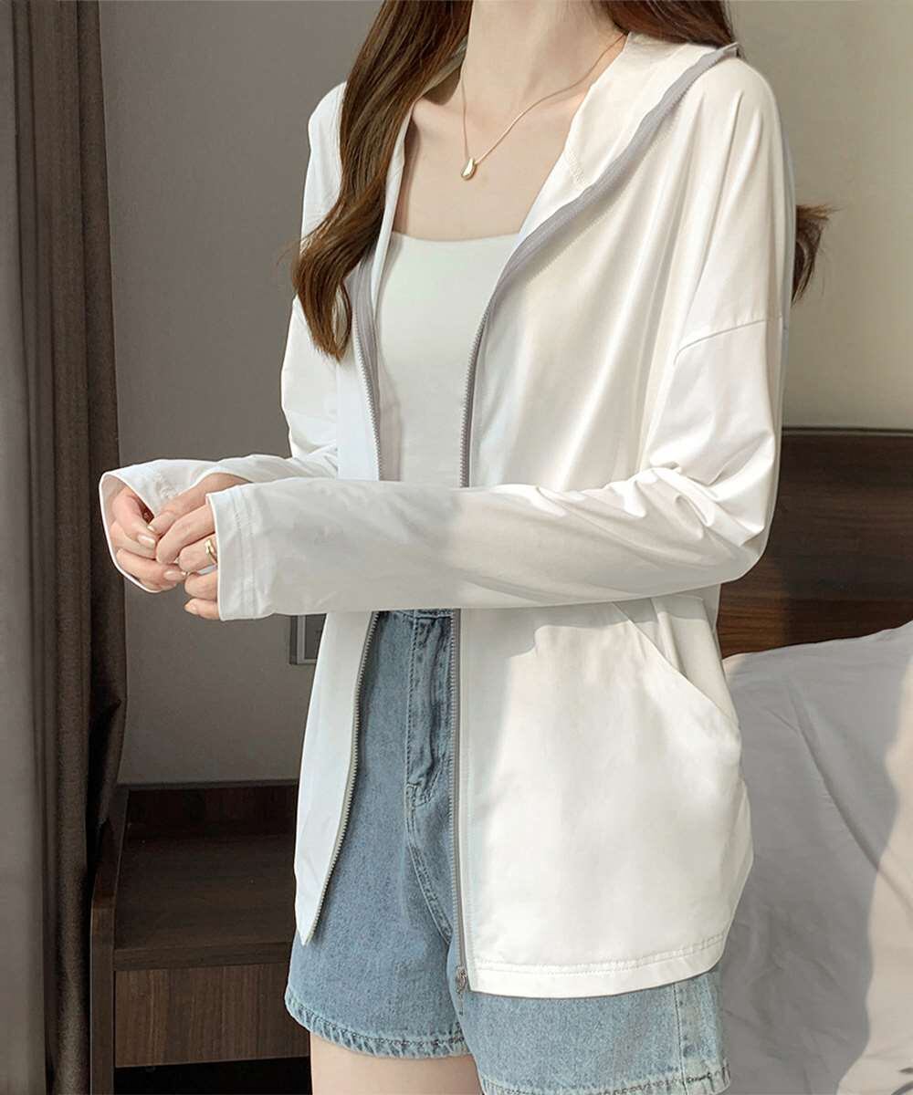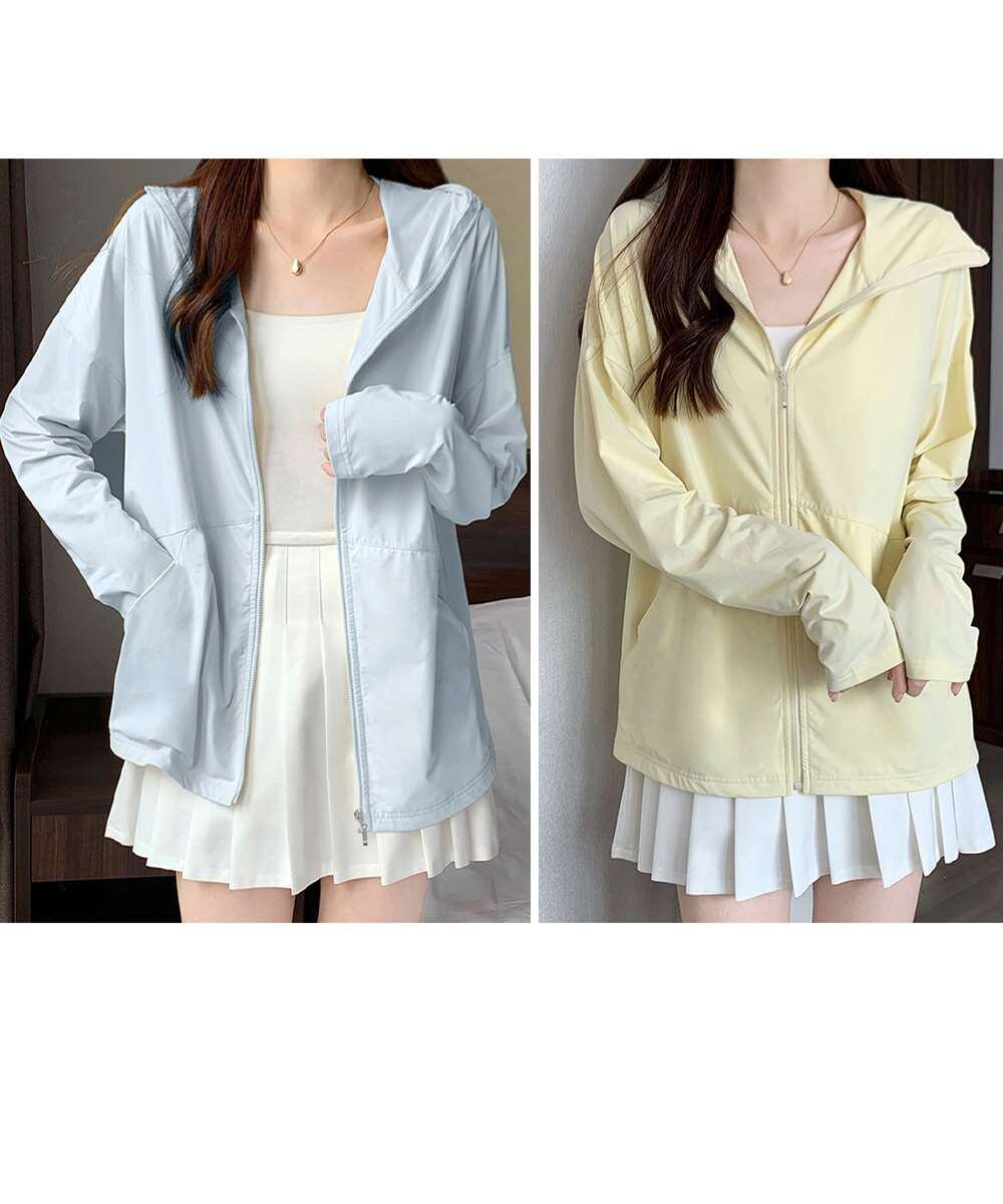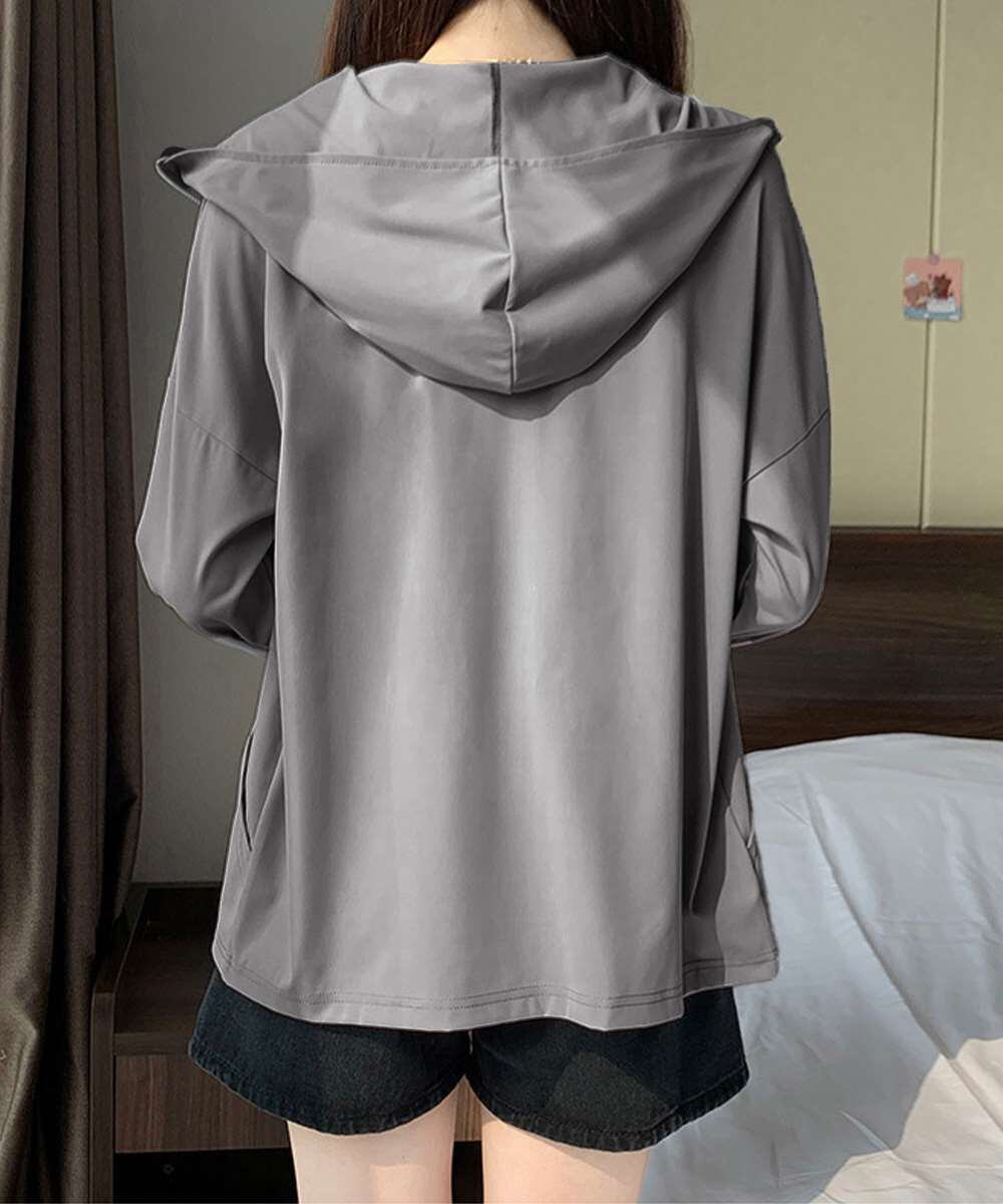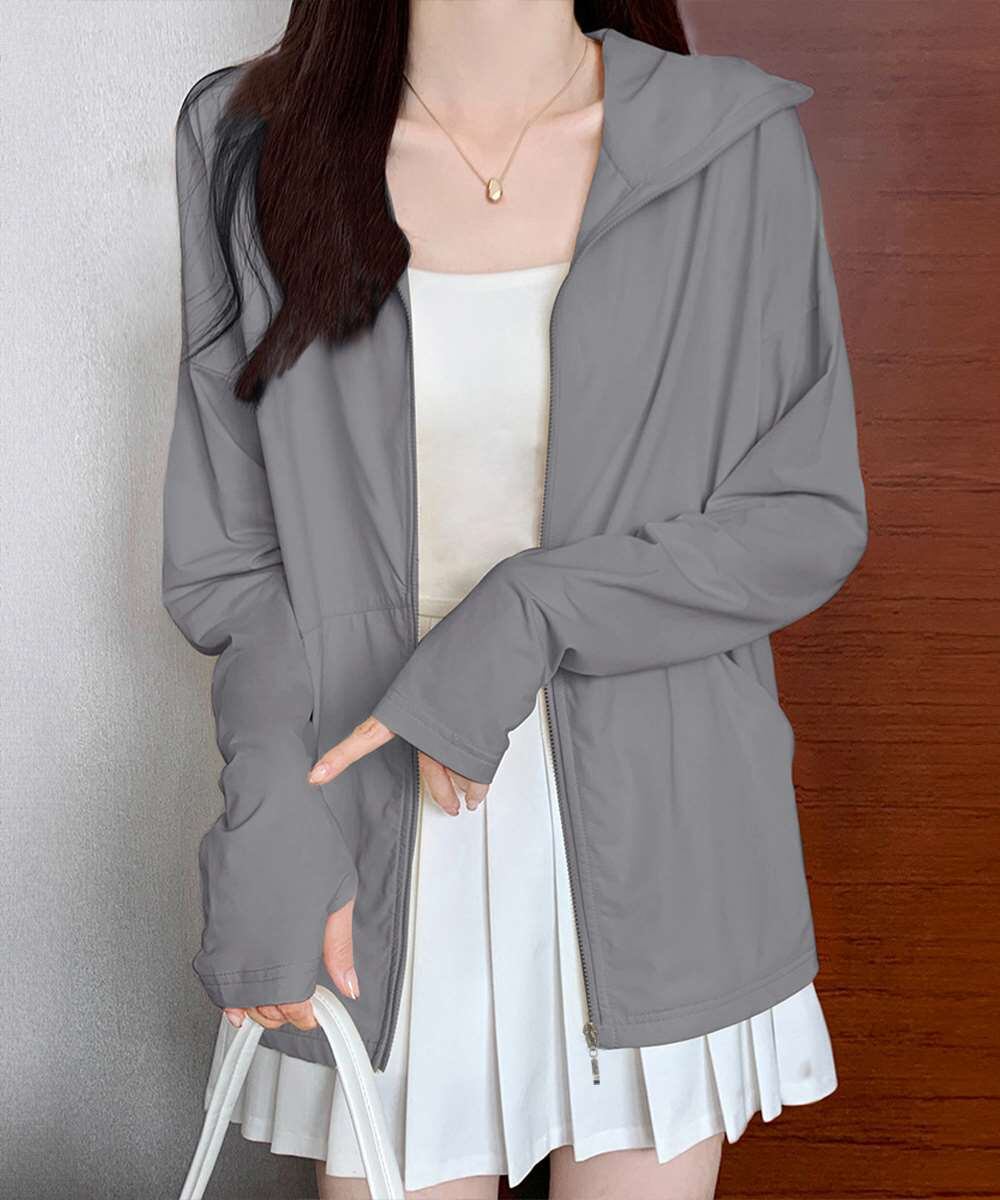 フード付き 指穴付きアウター 涼しい オーバーサイズ ジップアップトップス 紫外線対策羽織り 日焼け止めラッシュパーカー