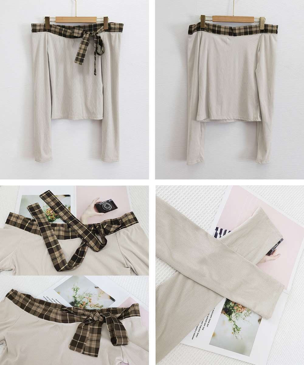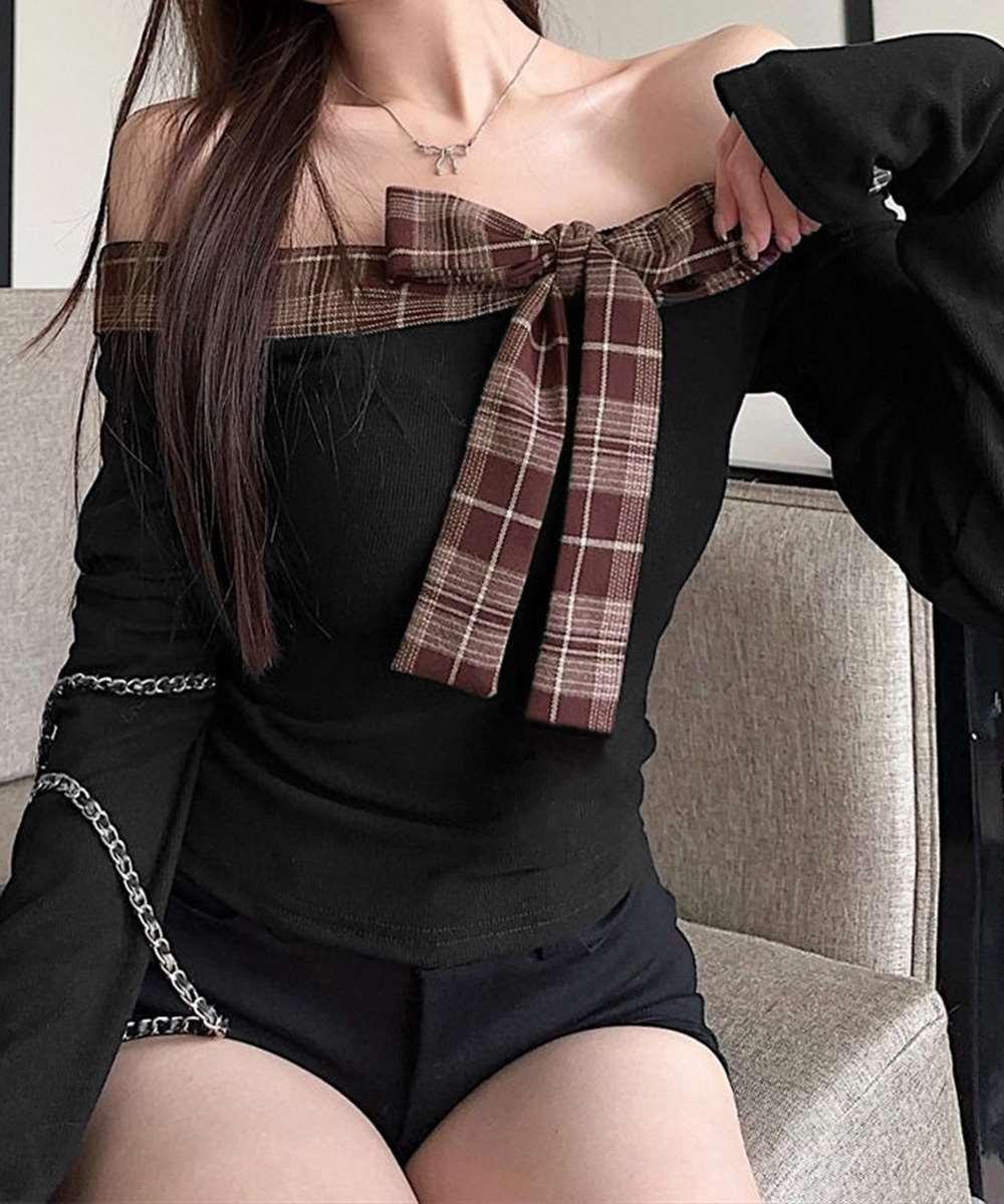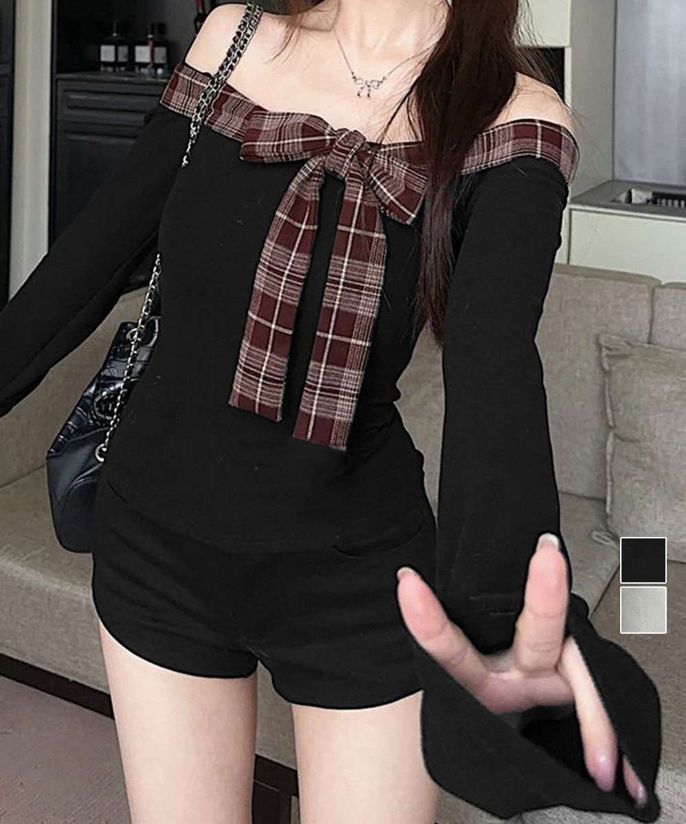 肩開きのチェックリボン付き長袖トップス。