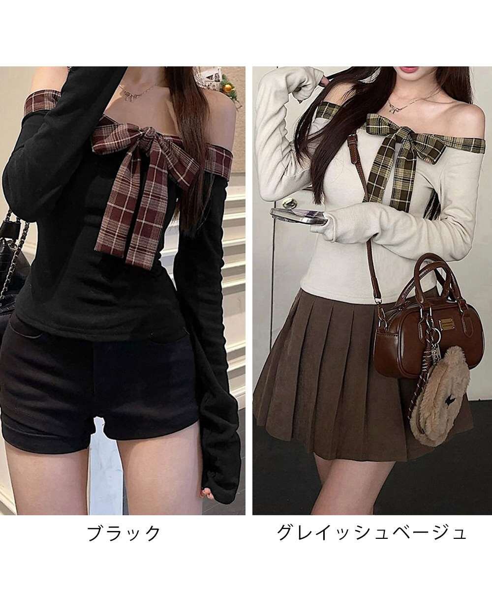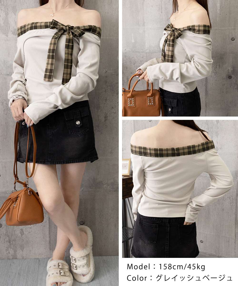 オフショルダー 長袖 Tシャツ チェック リボン