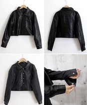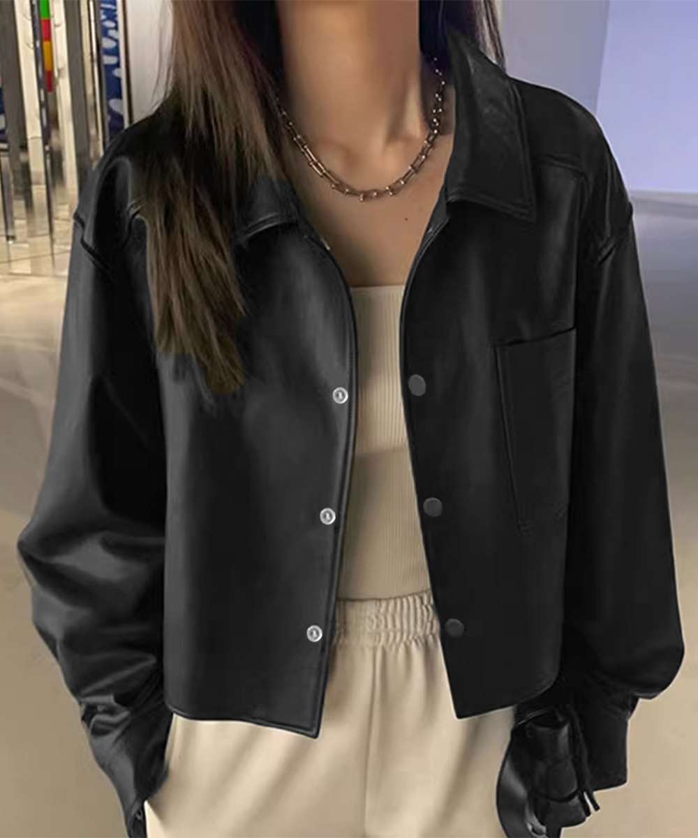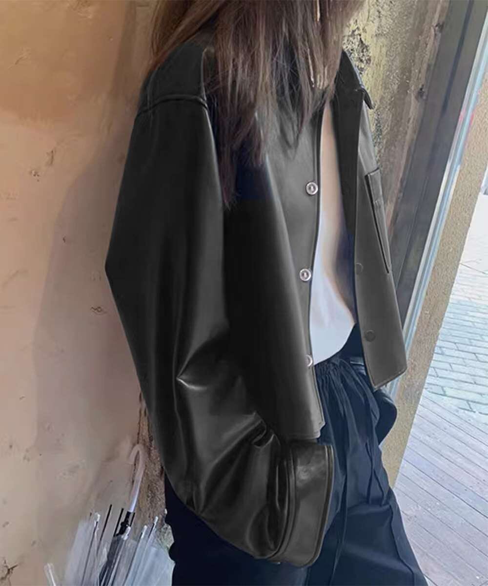 すっきりしたシルエットでシャープな印象の、ショート丈フェイクレザージャケットが新登場。