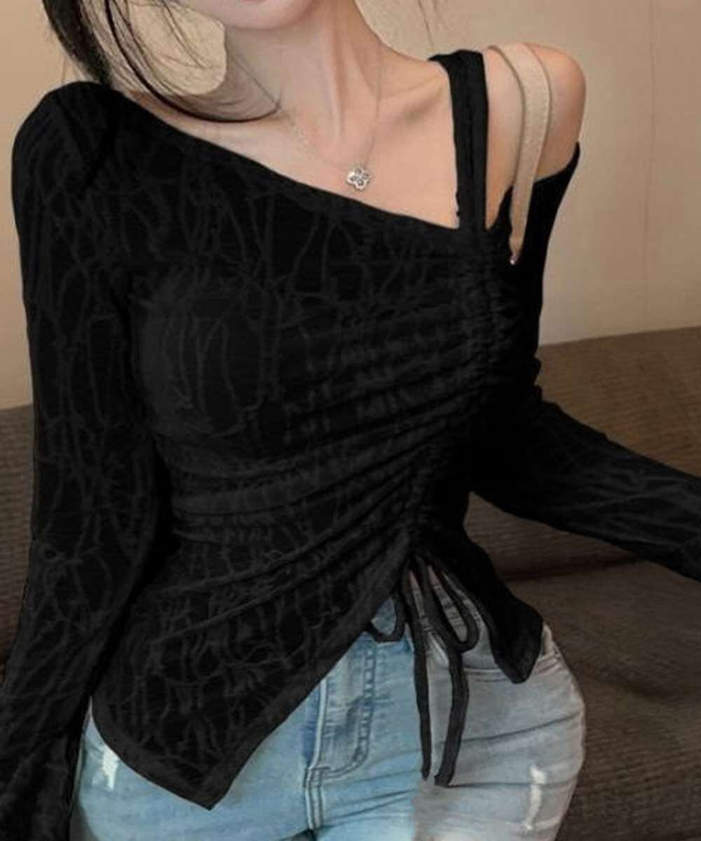 アシンメトリードロストトップス フレア袖カットソー シャーリングリボン タイトTシャツ シースルーレーストップスセクシー