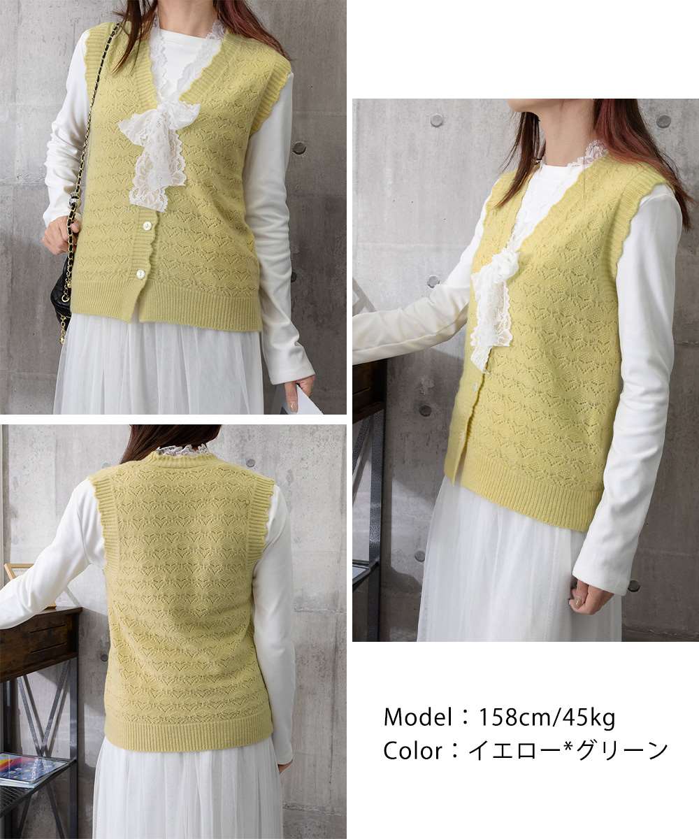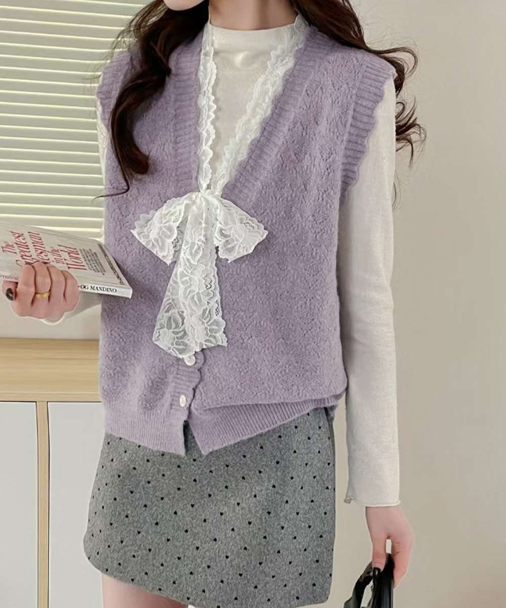 ネックラインにレースをあしらい、リボンがポイントになったニットベスト。