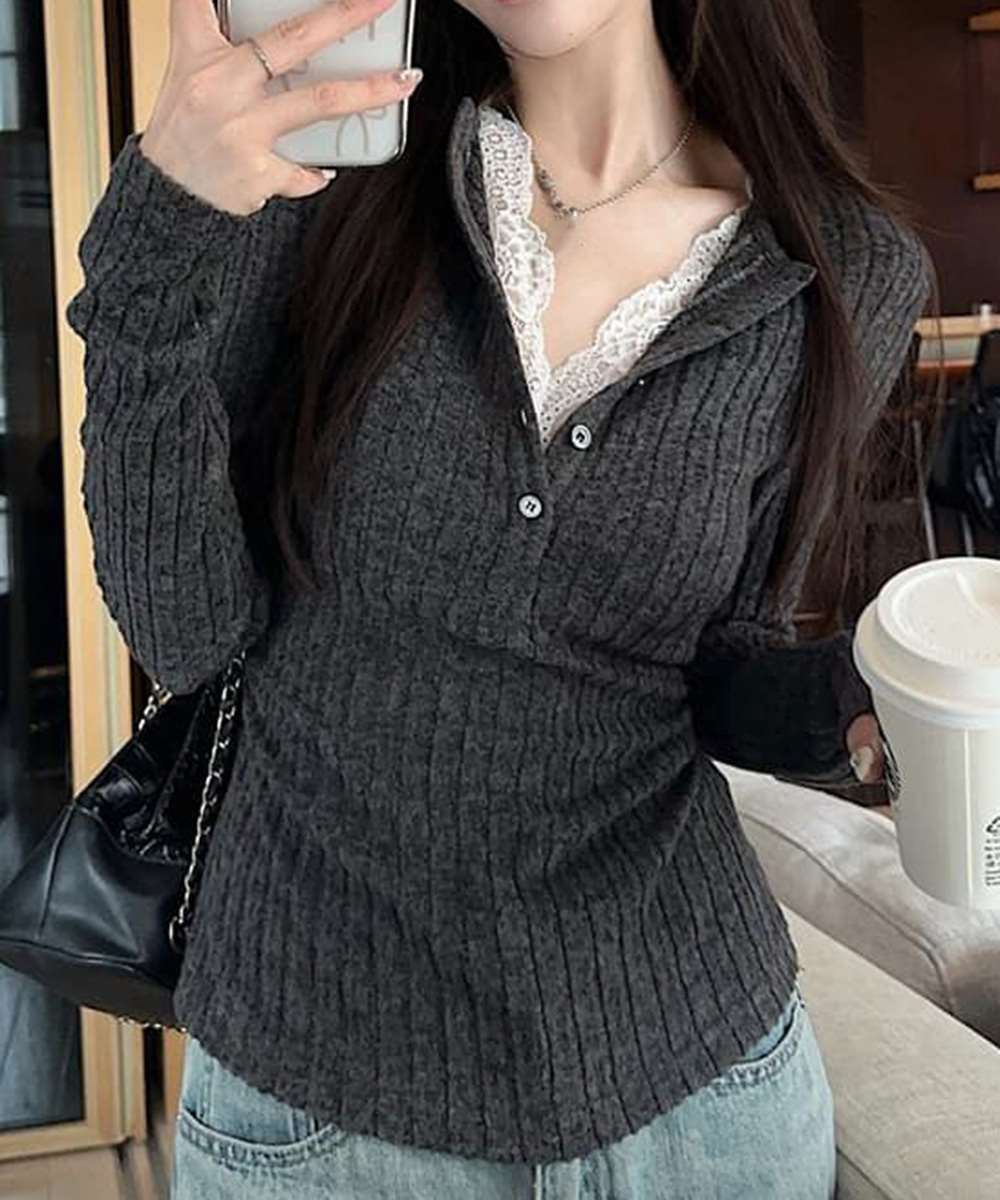首元はVネックで、レースの切り替えがさりげないアクセントに。