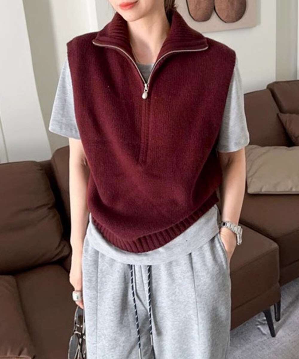 スタンドカラーとハーフジップが特徴的なニットベスト。