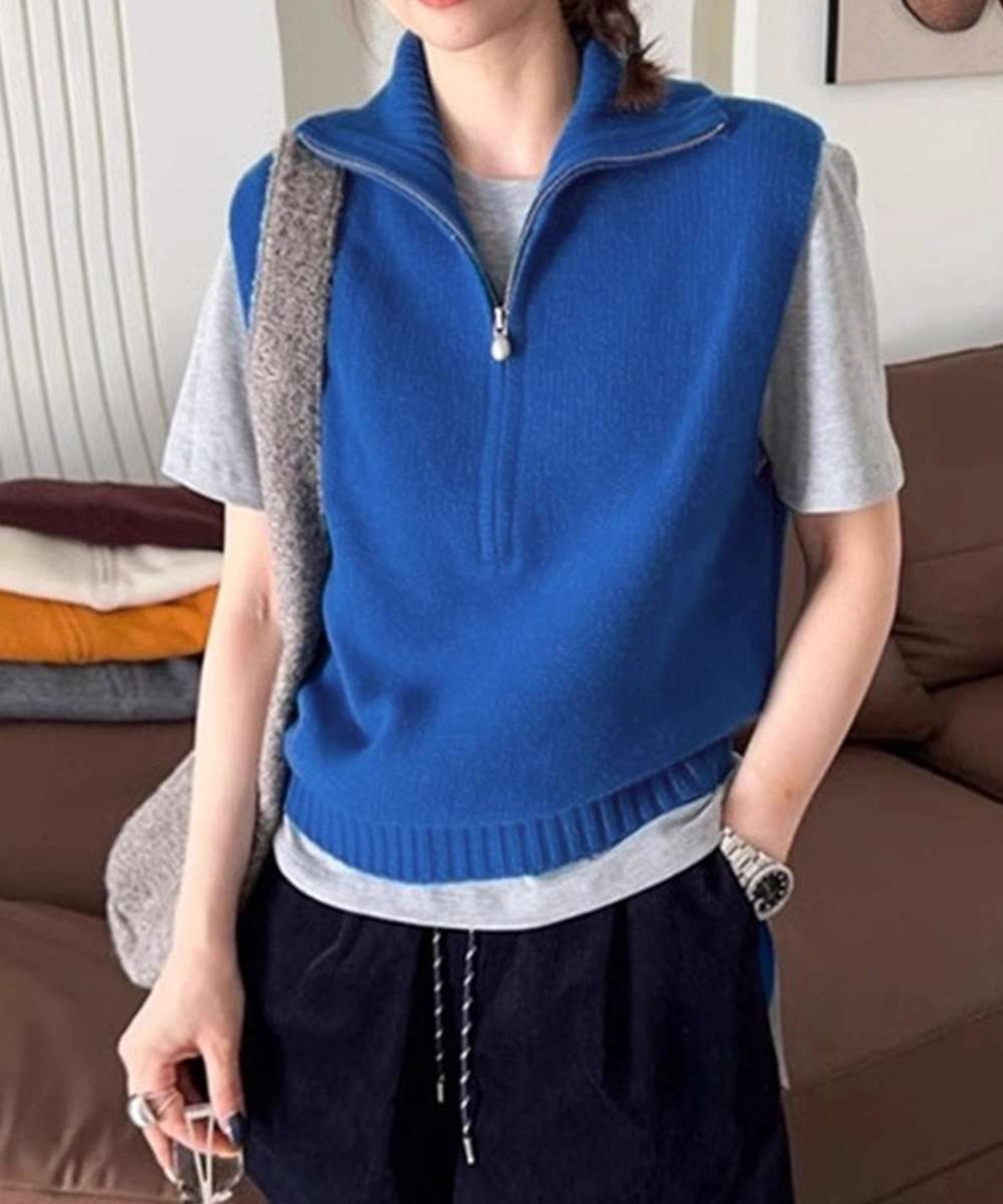 キーワード:ジップアップベスト 袖なしニット韓国風 レイヤードチョッキ