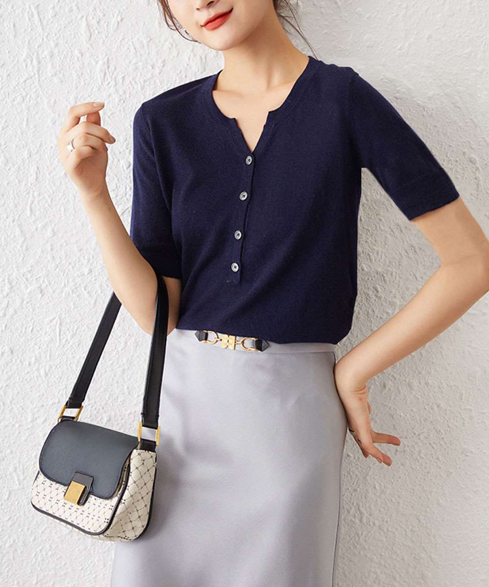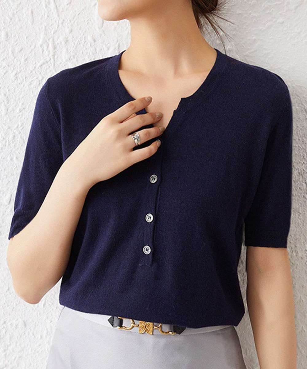 柔らかなサマーニット素材で着心地が良く、シンプルながらも上品な印象を演出する。
