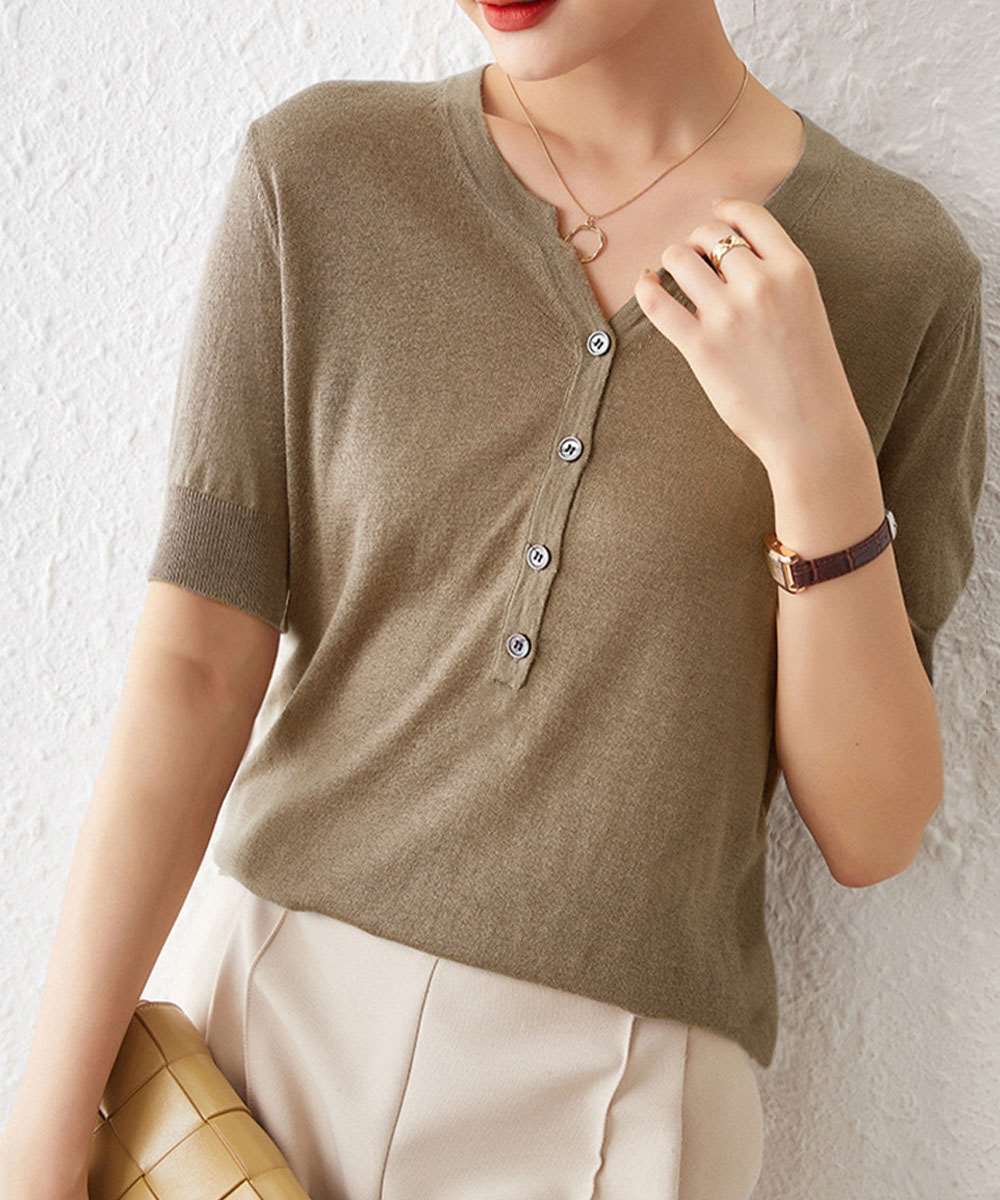 すっきりとしたシルエットが魅力のVネック半袖ニットトップス。