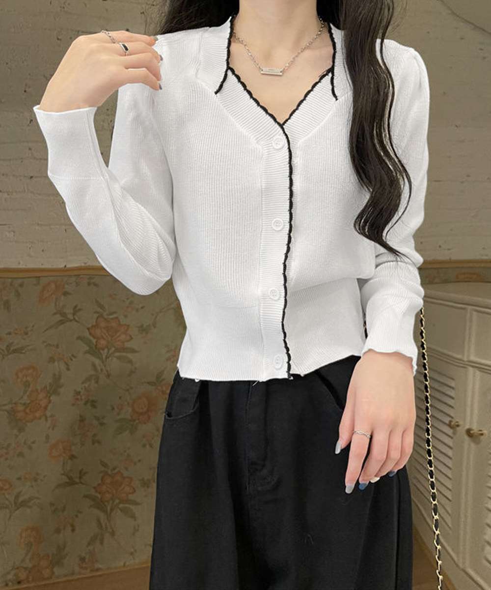 Vネックラインに施された黒のパイピングがアクセントとなり、洗練された雰囲気を演出。