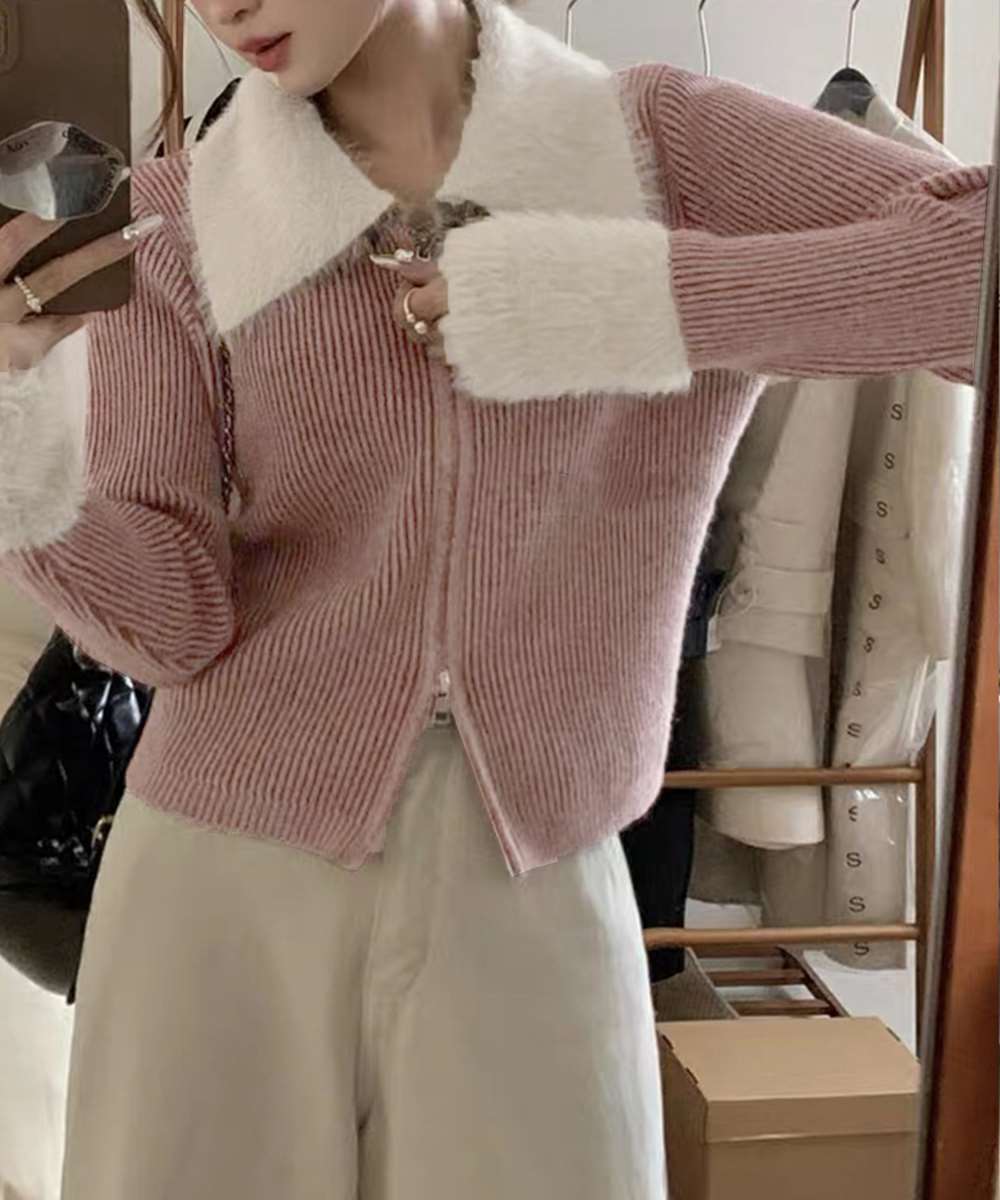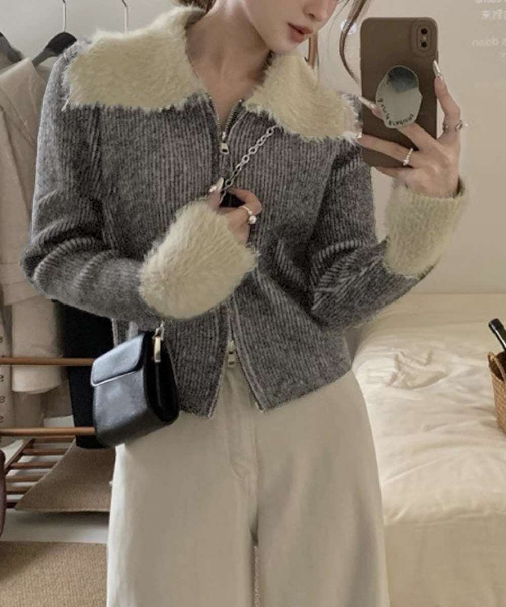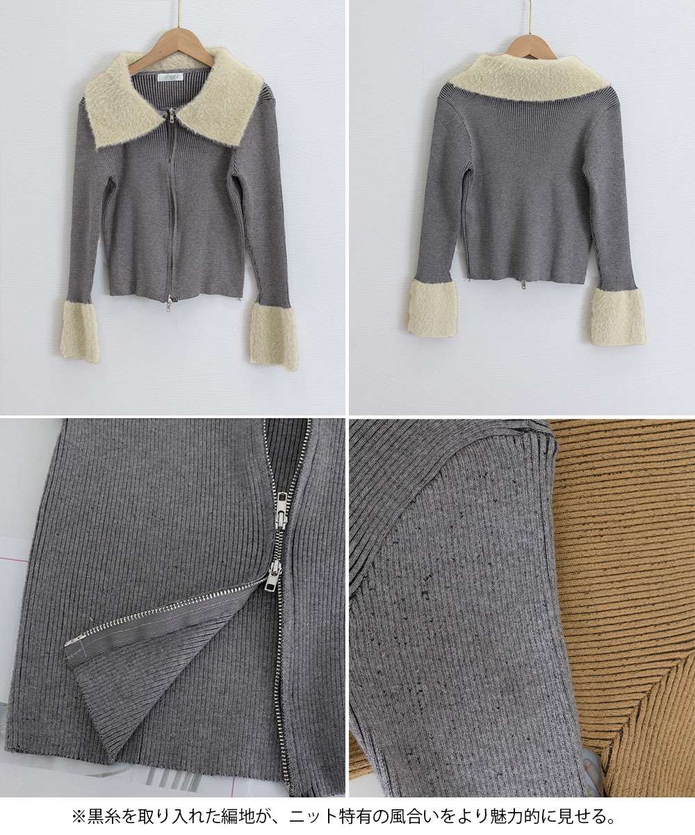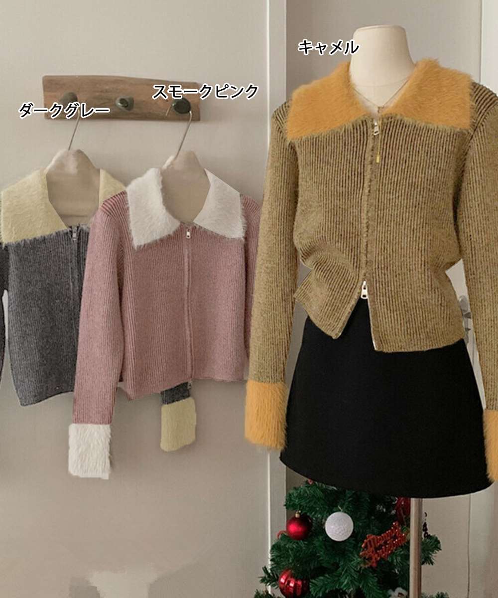 上品なフェイクファーをあしらったダブルジップアップ仕様のニットカーディガン。