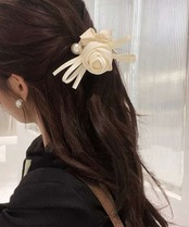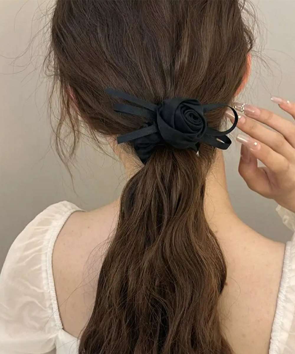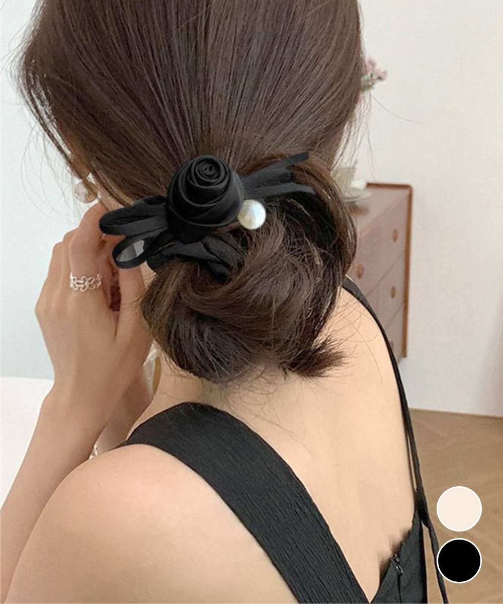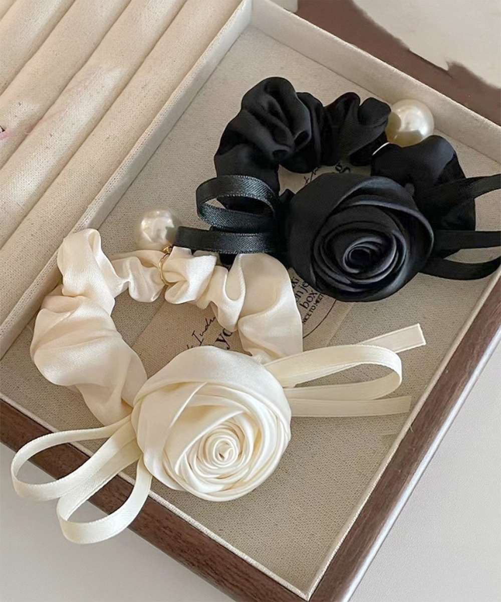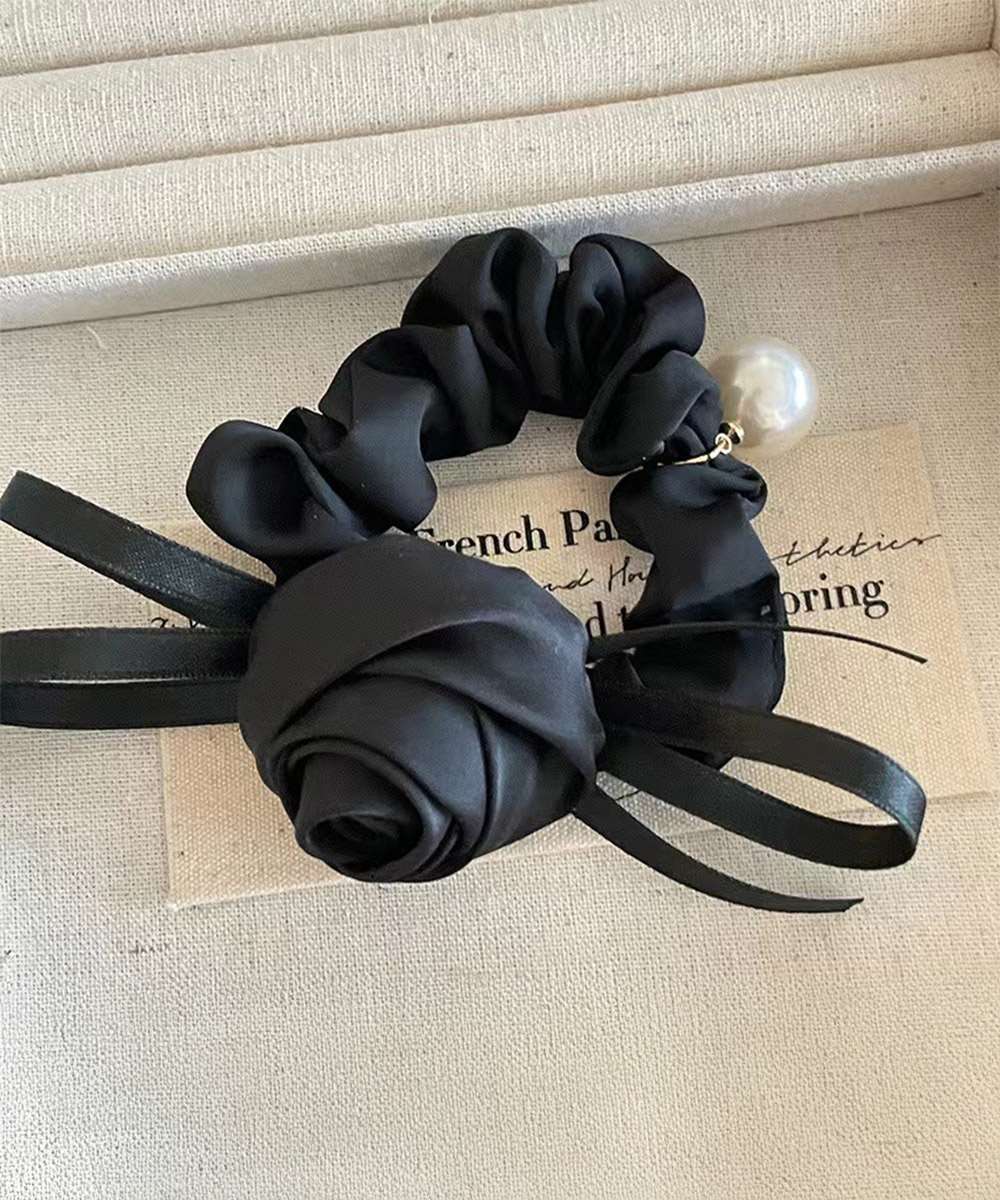 サテン生地で作られたローズモチーフのヘアシュシュ。