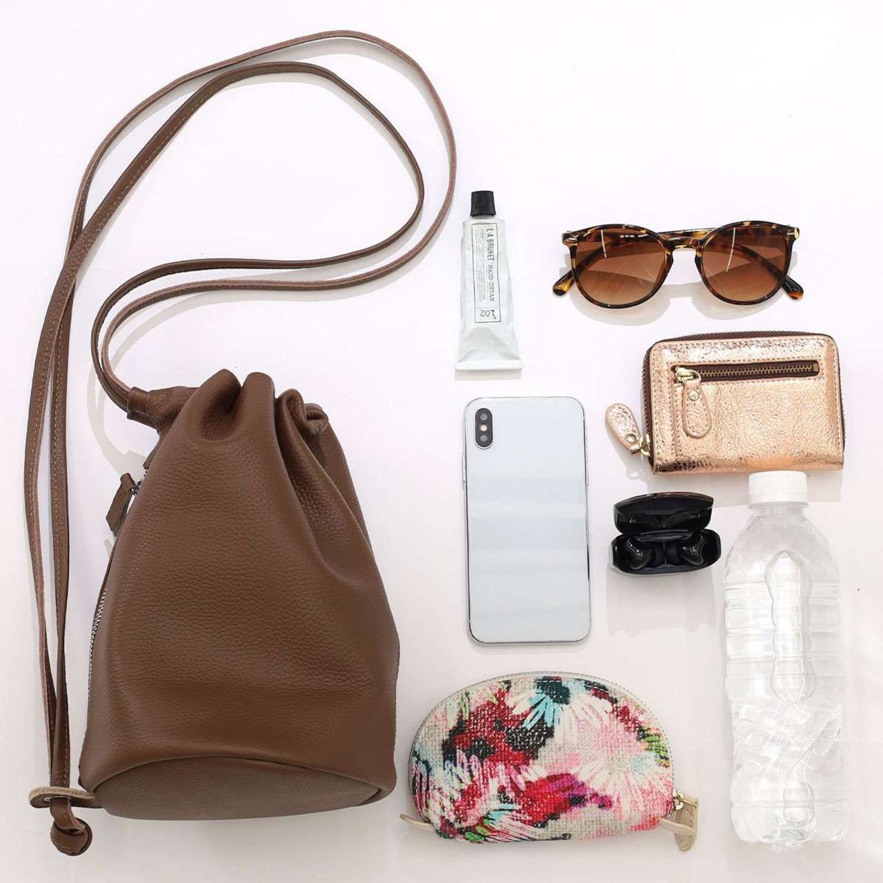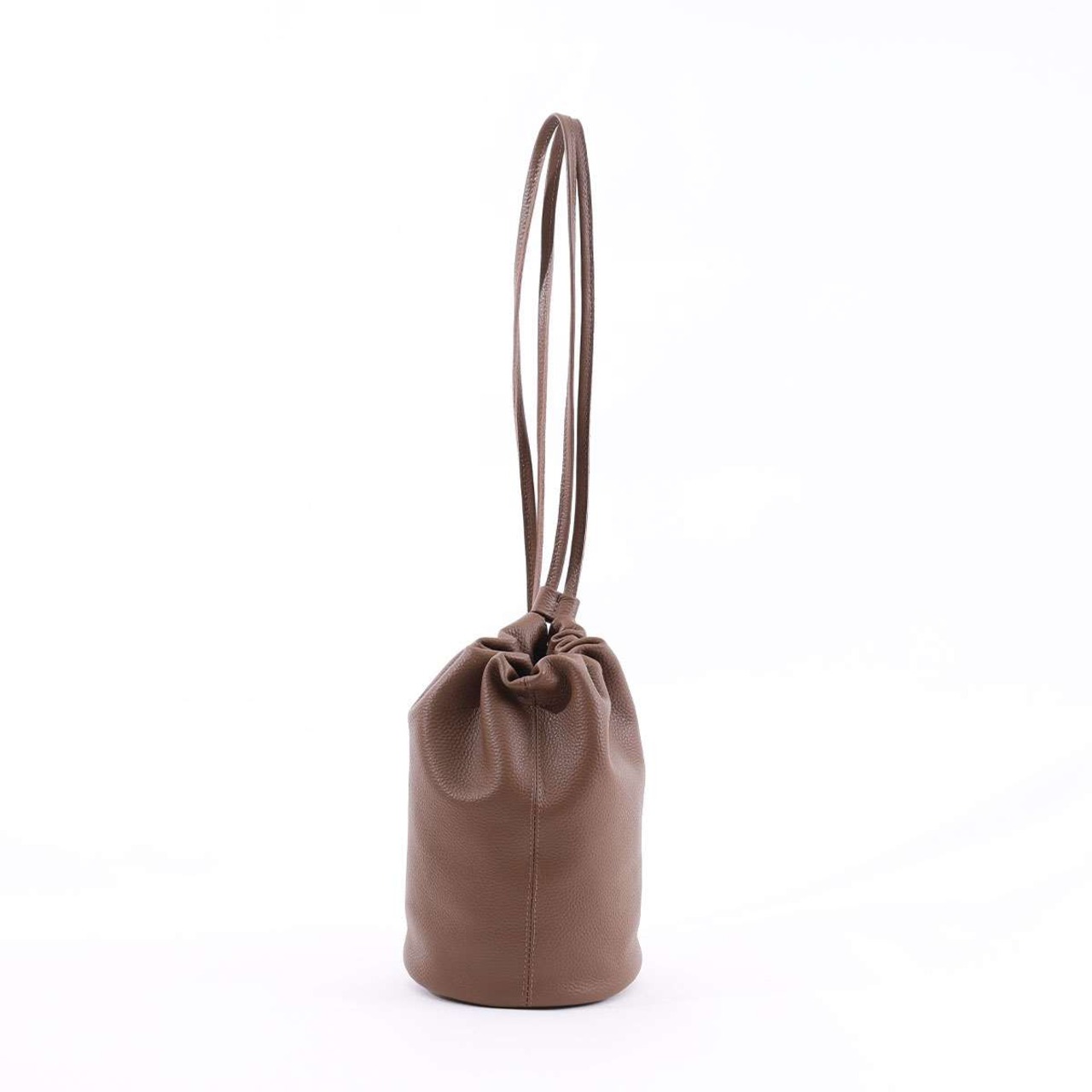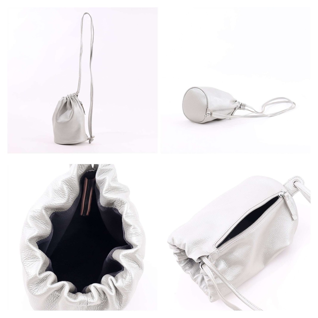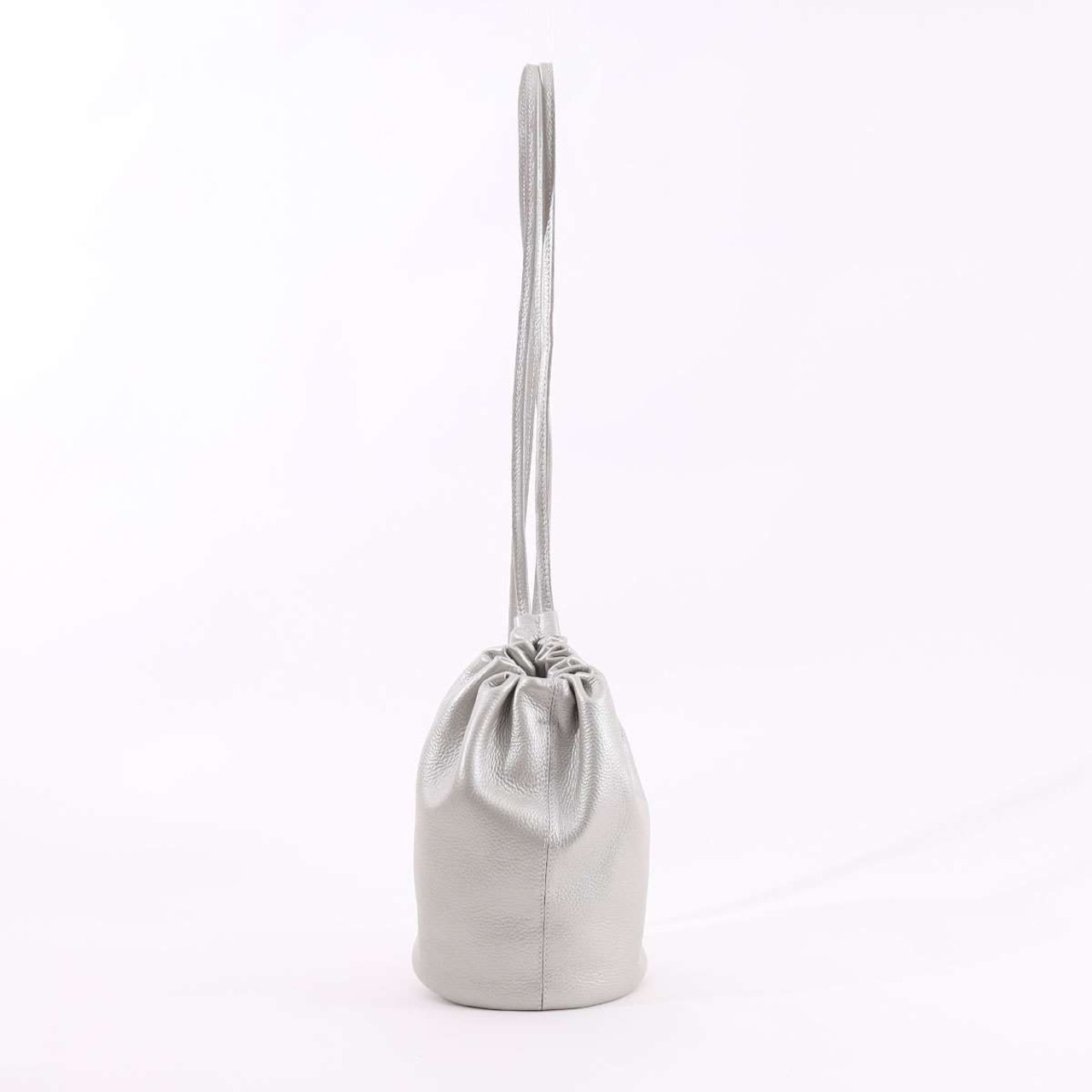 洗練されたスタイリングを演出するドローストリングバッグ。