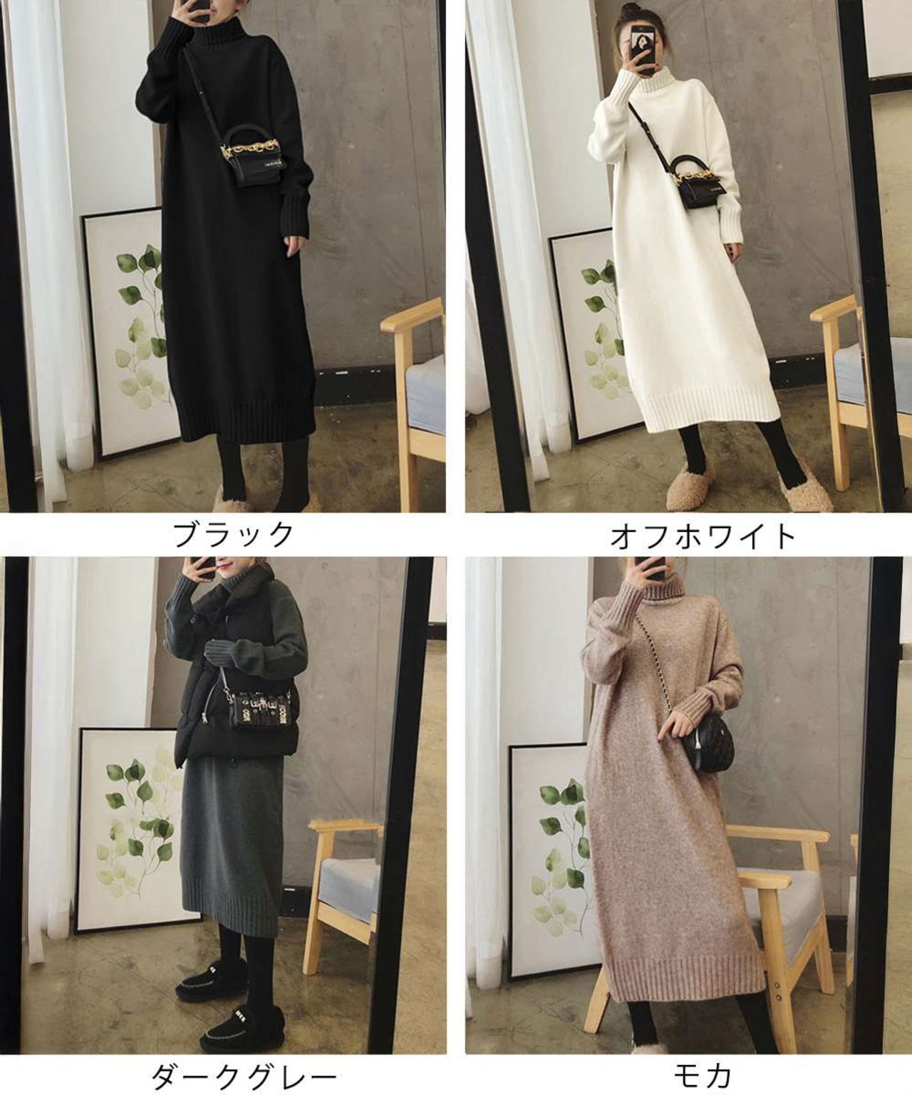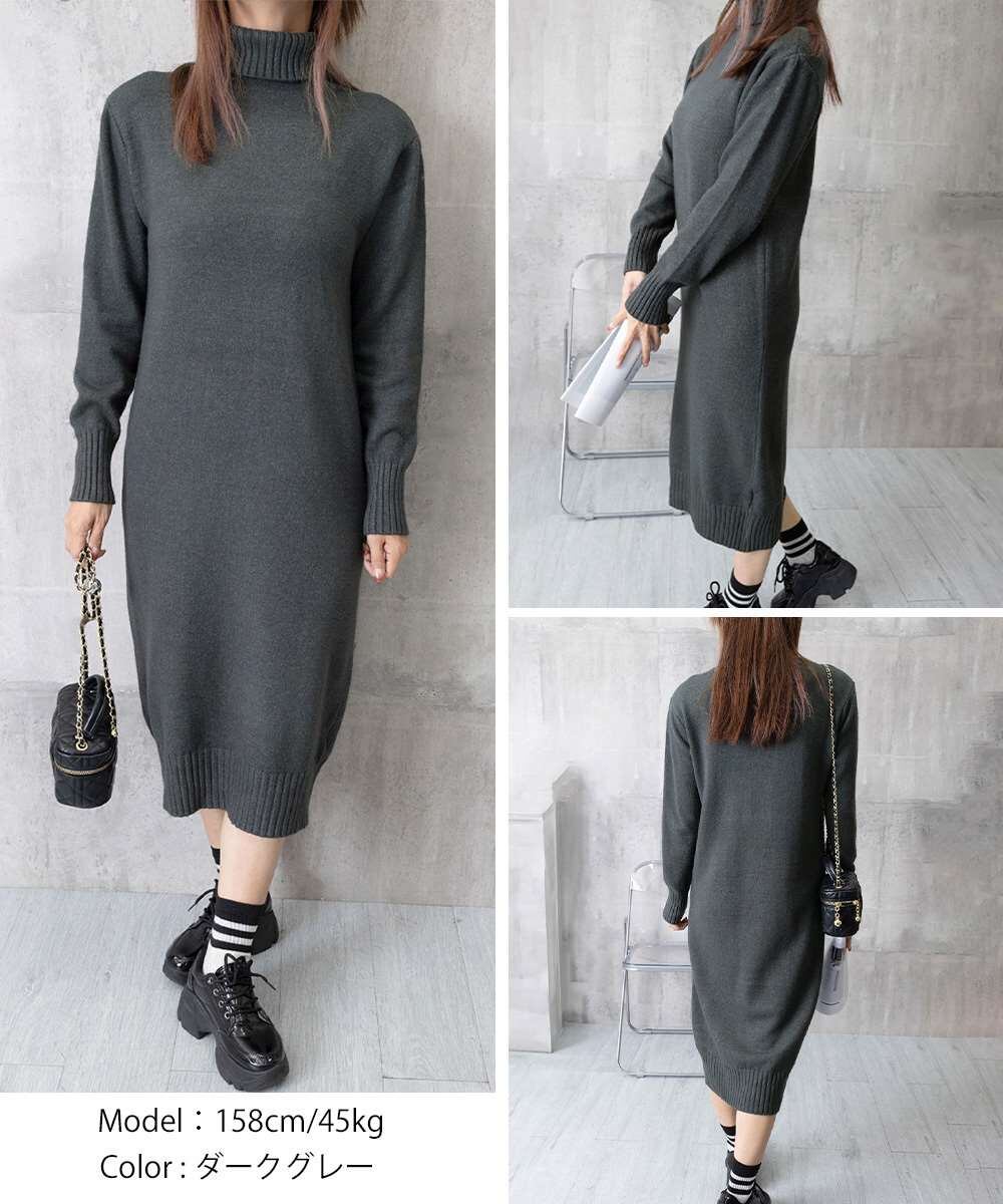 顔周りを印象的に魅せるタートルネックで、首元までしっかり暖かいロング丈ニットワンピース。
