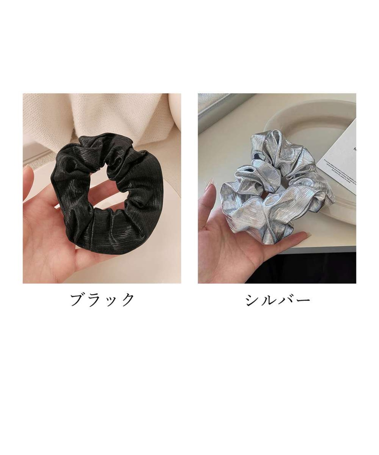 光沢感のある素材を使用した、おしゃれなシュシュ。