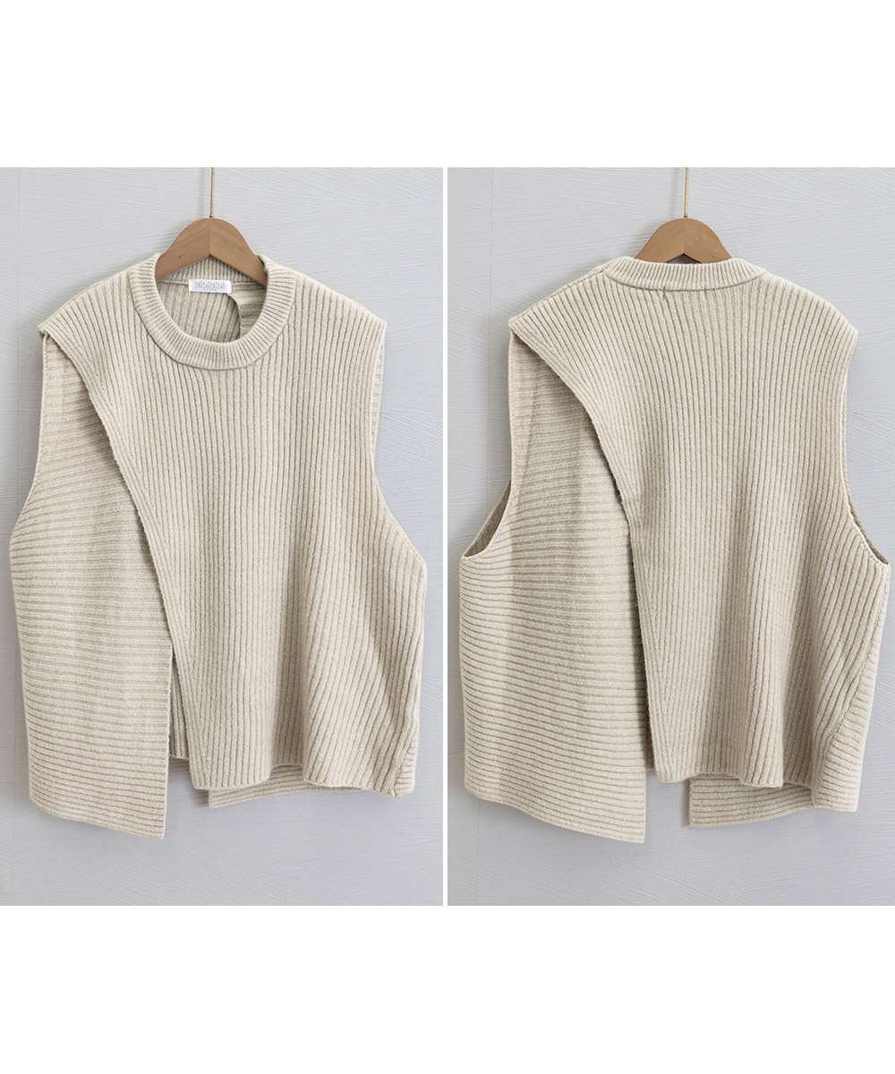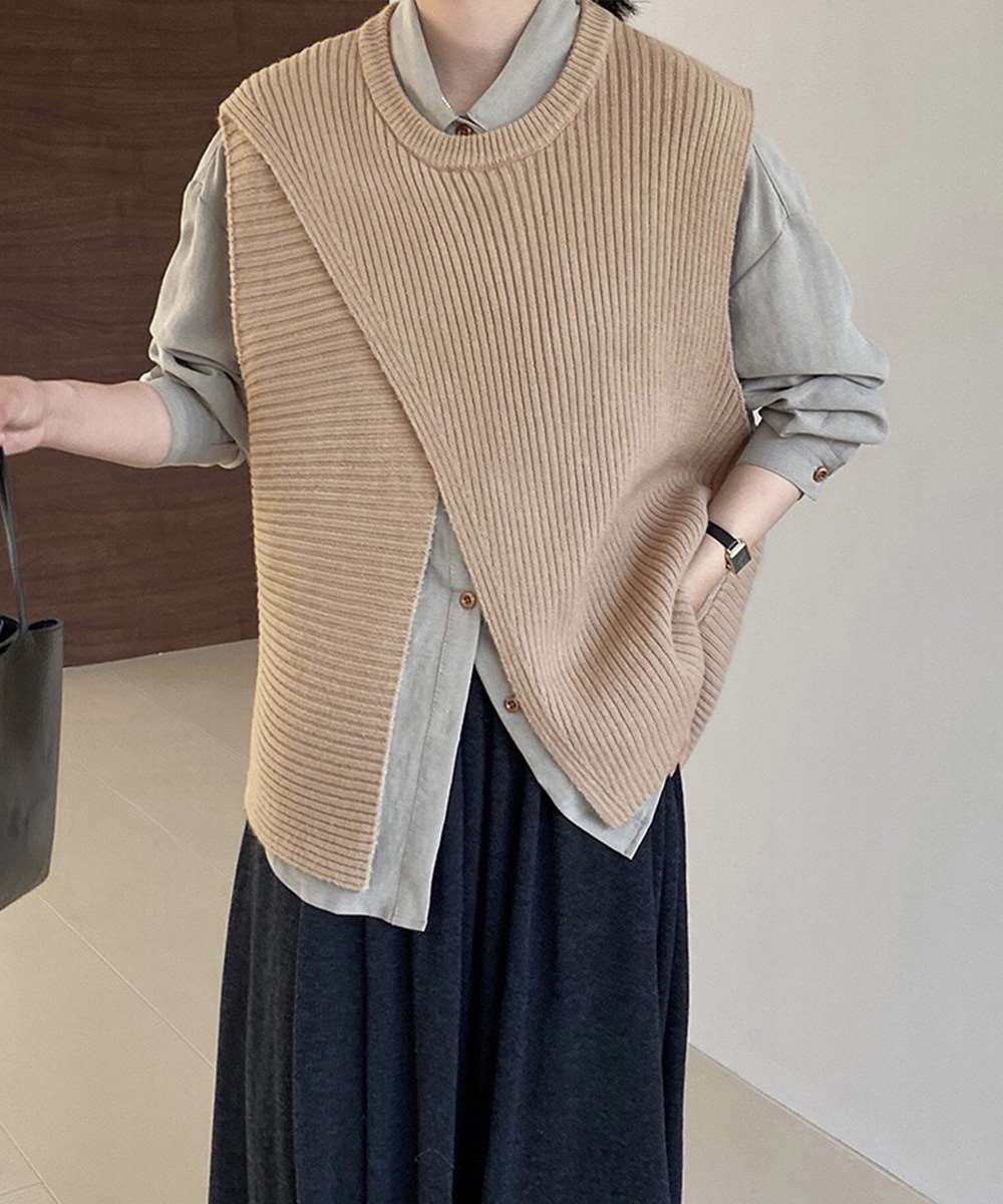 キーワード:袖なしニット着やせ 体型カバートップス レイヤードジレ