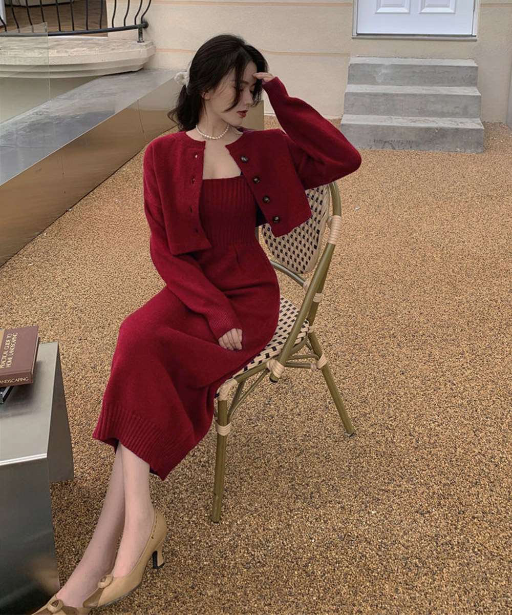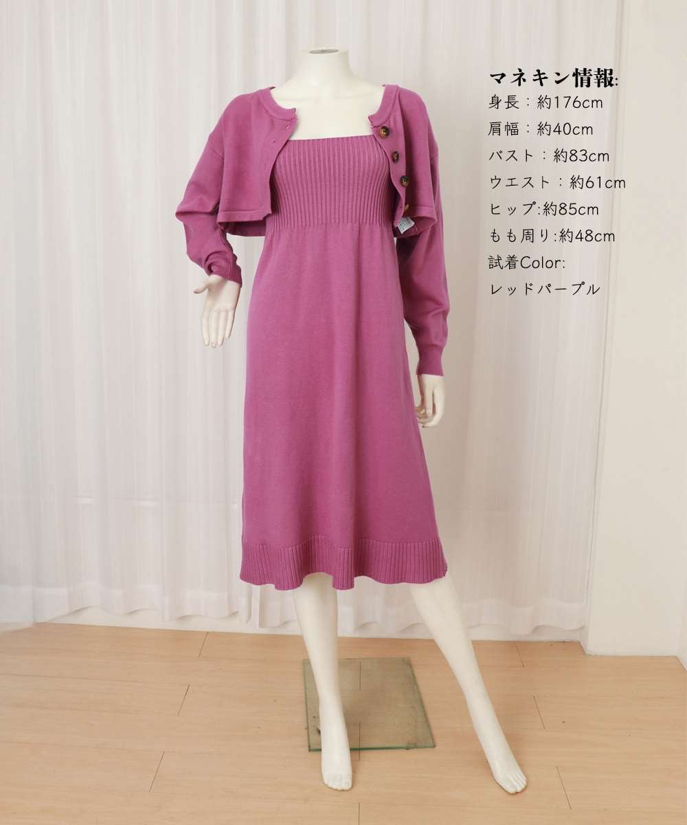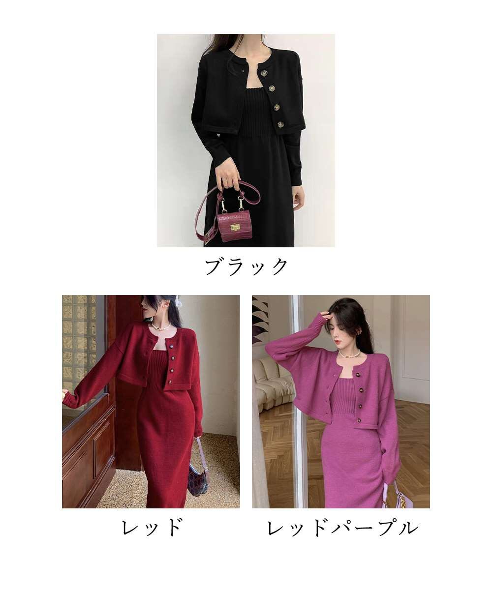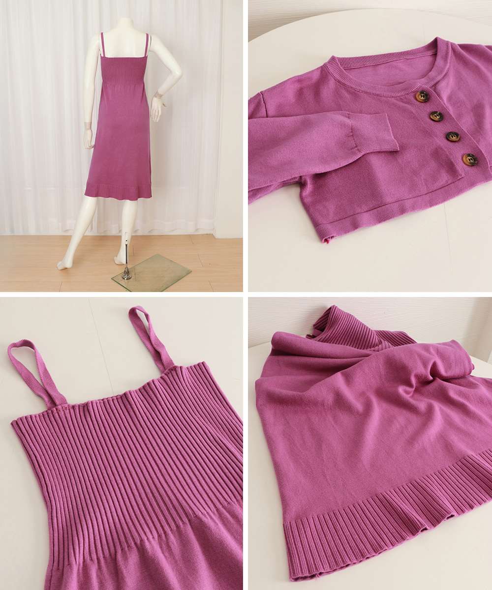 ショート丈カーディガンとリブニットワンピースの2点セットで、着回し力抜群。