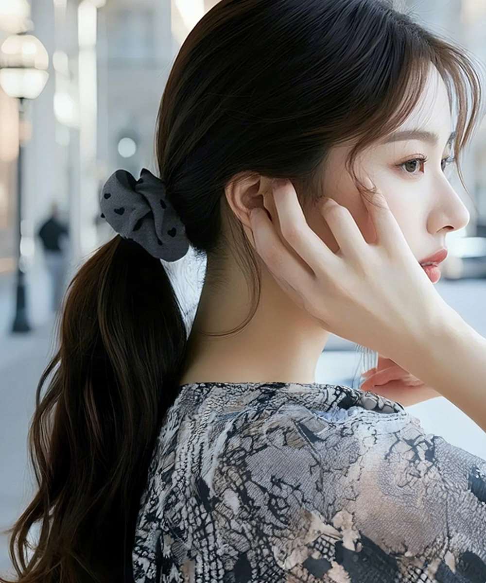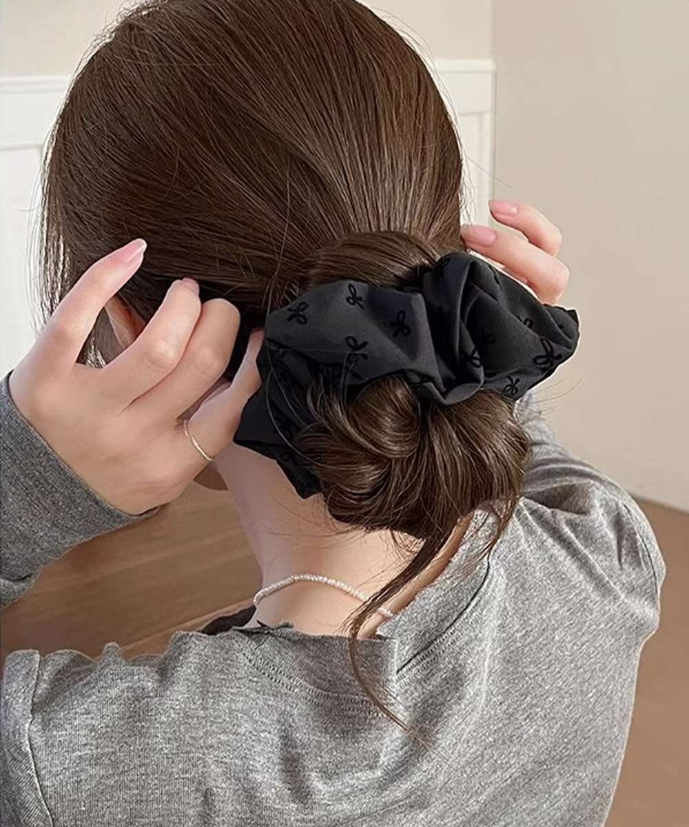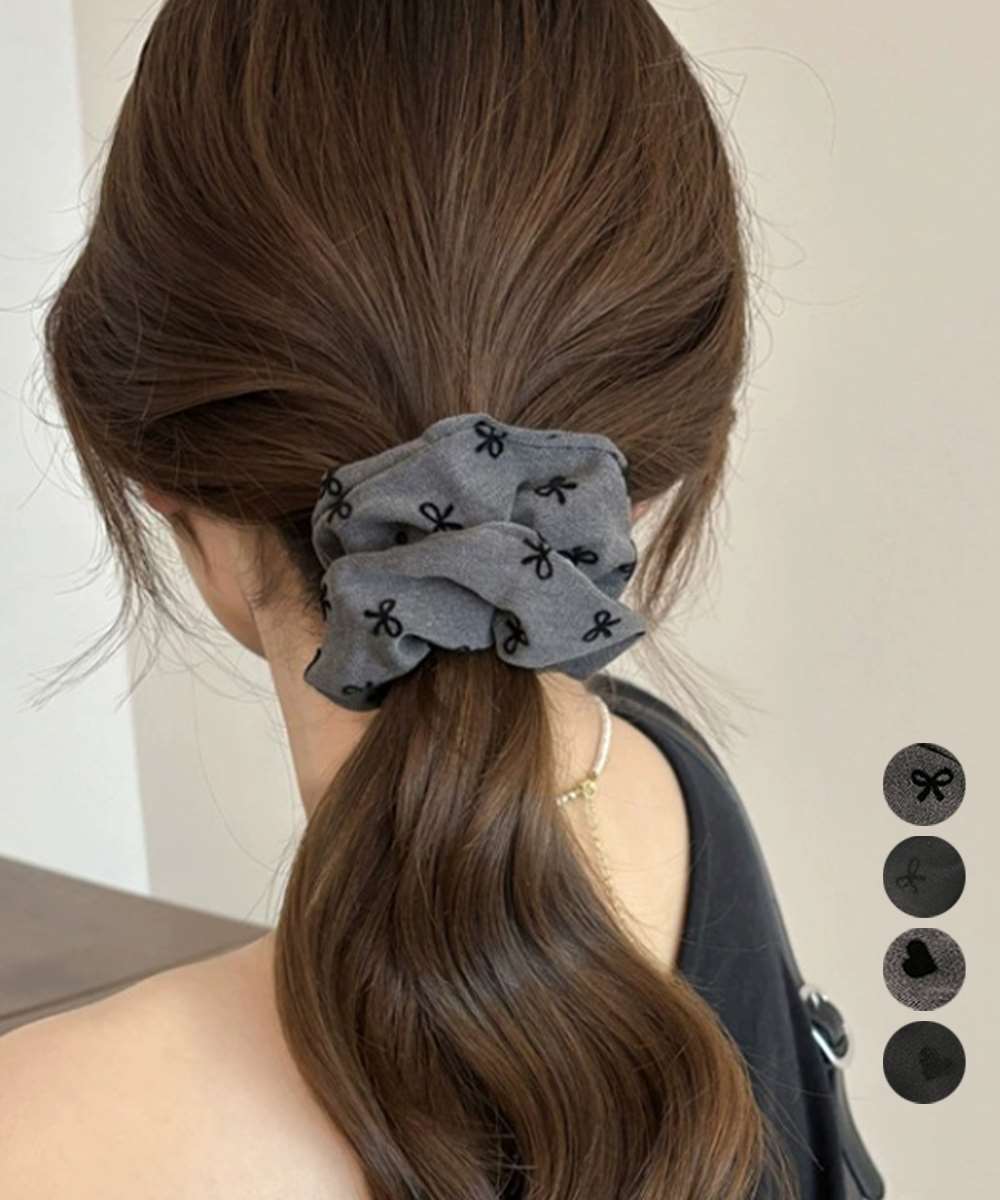 シンプルなモノトーンカラーに、さりげない柄がアクセントのシュシュ。