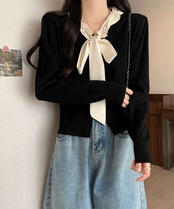 クラシカルな雰囲気が魅力のリボン付きニットトップス。