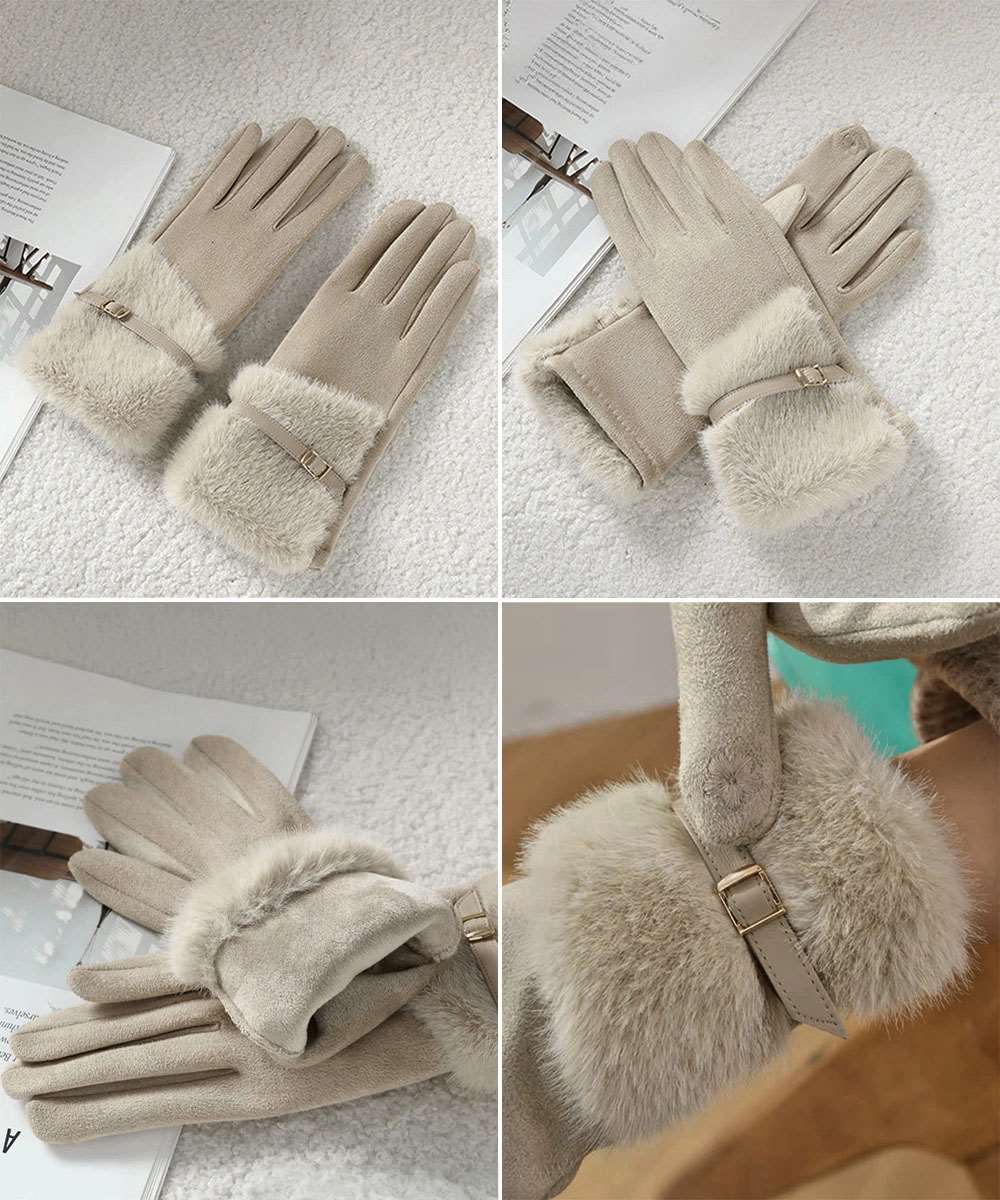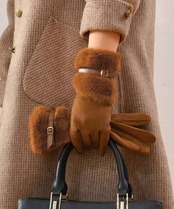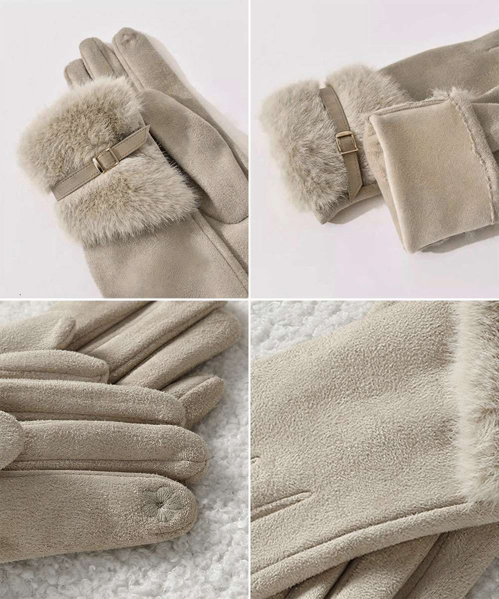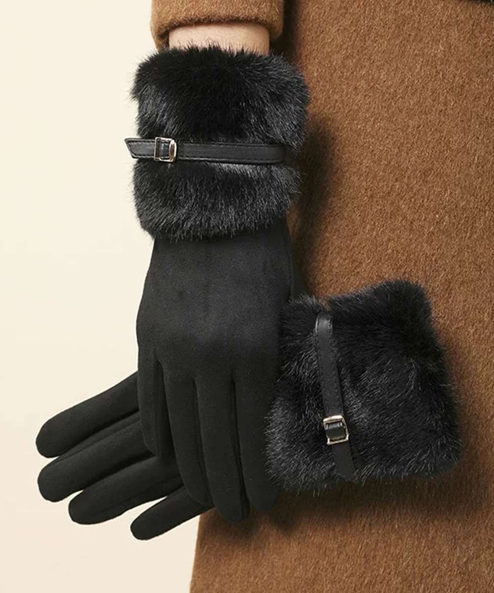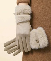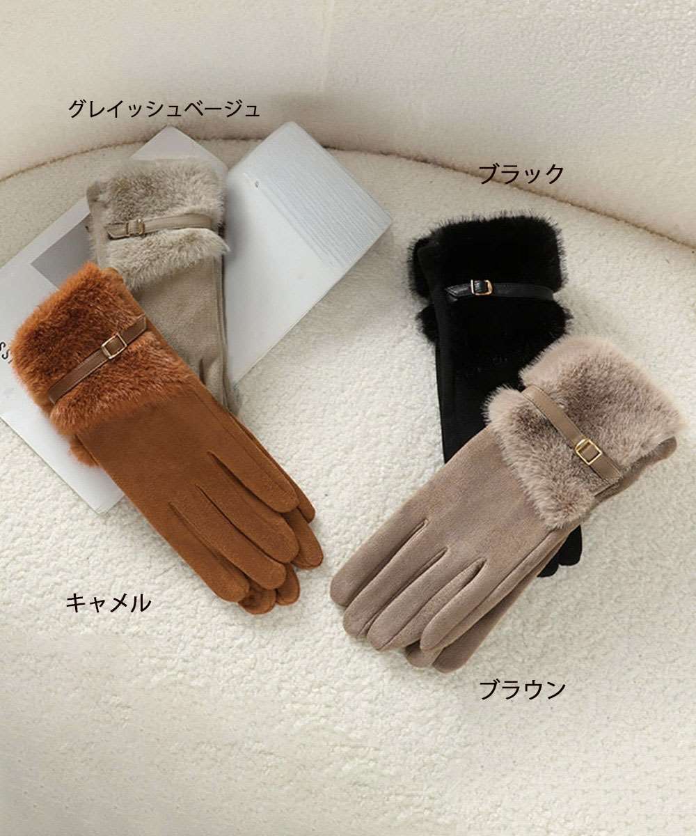 やわらかなスエード調素材にファーをあしらった、上品でフェミニンなデザインの手袋。